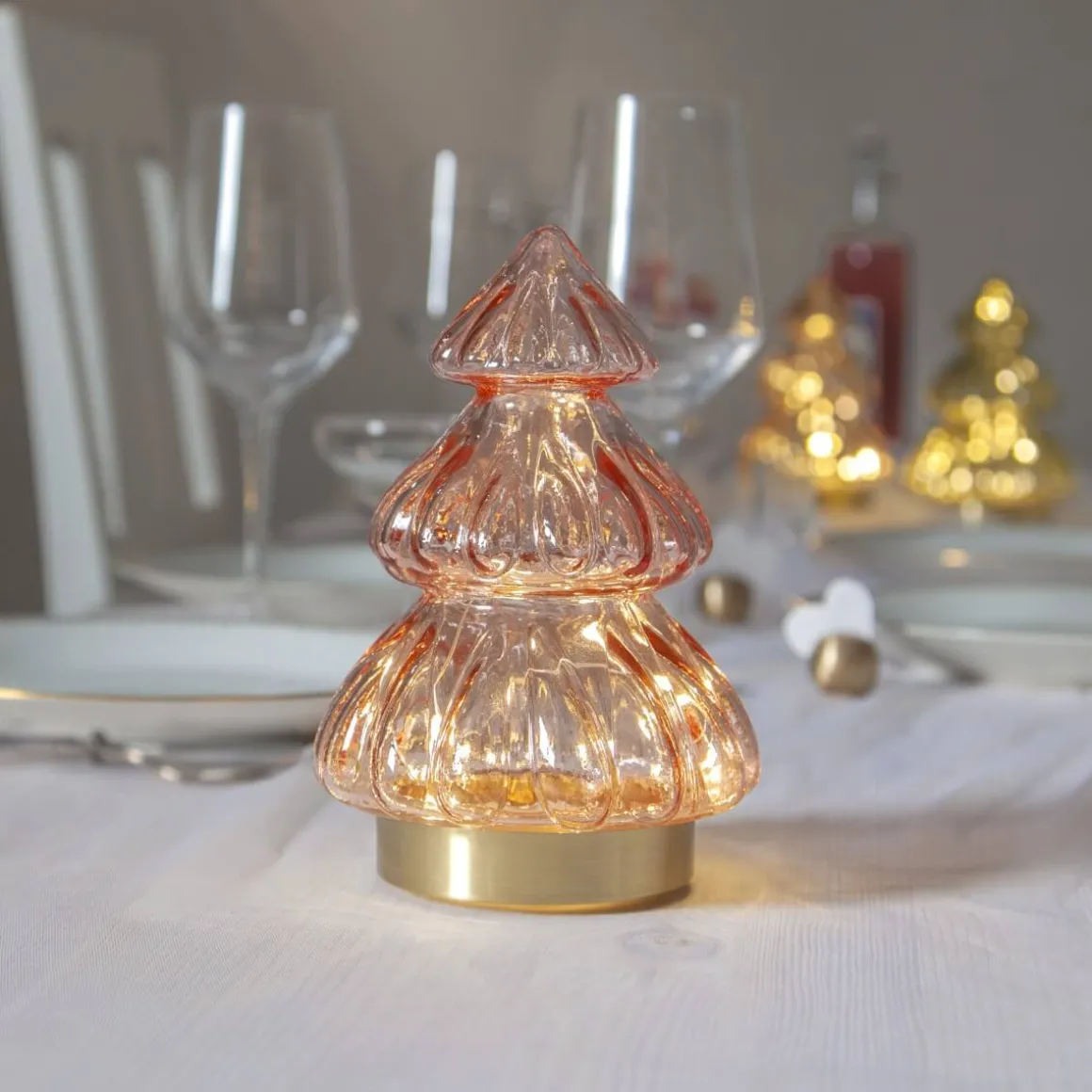 Så vacker bordsdekoration i form av en gran i transparent svagt rosafärgat glas. Guldfärgad bas som diskret gömmer batteriboxen. Abete drivs av 3 st AAA batterier och har självklart en inbyggd timerfunktion så att du lätt kan ställa in när du vill att den ska lysa. Perfekt som dekoration på det dukade julbordet. Batterier köpes separat.