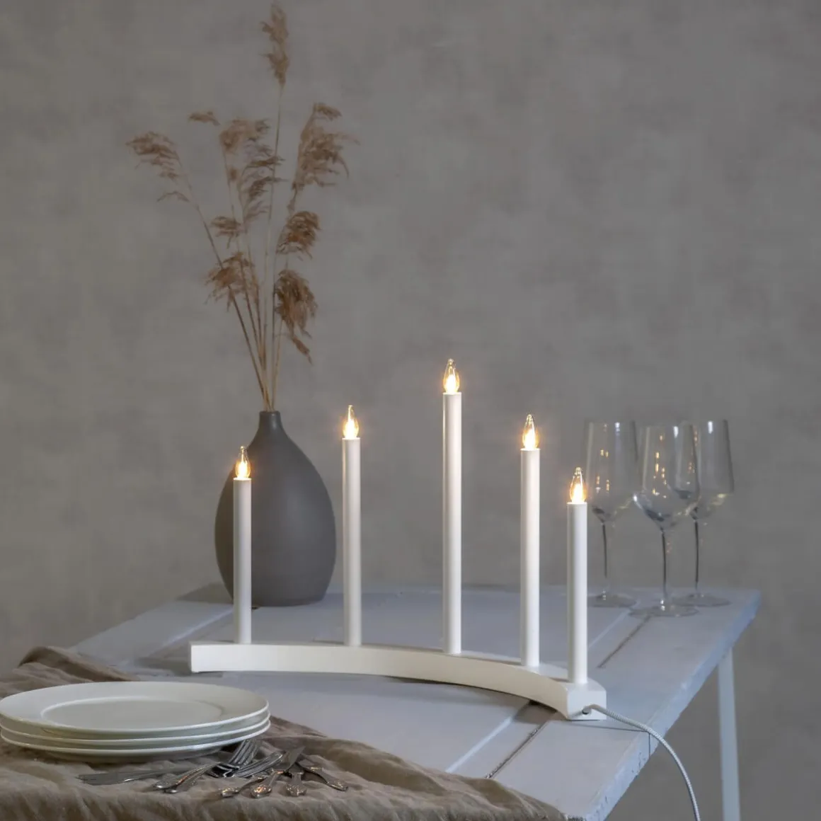 Stilren ljusstake med en läckert böjd bas i trä med 5 kraftiga ljuspipor i metall. Nytänkande design som ger ett mjukt och härligt sken i ditt hem. Här ser du läcka Accent i vitt.