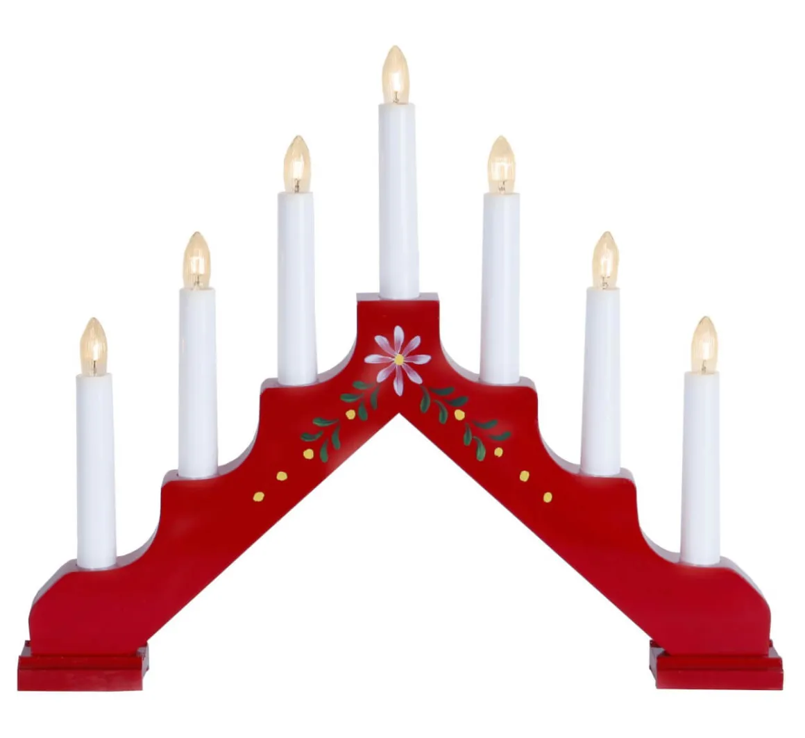 Röd 7-armad träljusstake med fina dekorativa mönster från Star Trading. En vacker adventsljusstake med härligt sken. Placera ljusstaken exempelvis i fönstret för att skapa en härlig julstämning i hemmet.