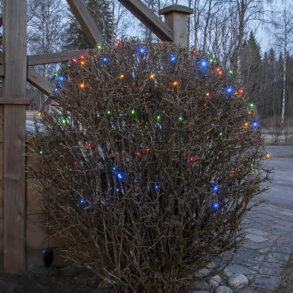 Batteridrivet nät med multifärgade dioder för utomhusbruk i storleken 0,8 meter gånger 1,5 meter, perfekt för den lite mindre busken eller trädet. Självklart med inbyggd timer så du enkelt kan ställa in när du vill att den ska lysa.