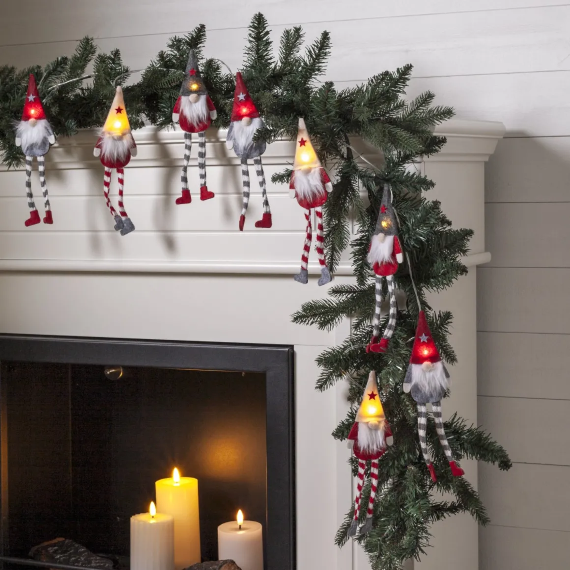 Härlig liten dekorationsslinga med små röd/grå tomtar gjorda av trä och tyg. Perfekt att dekorera med i ett blomsterarrangemang eller kanske på julbuffen. Drivs med 2 AA batterier och timer. Batterier ingår ej.