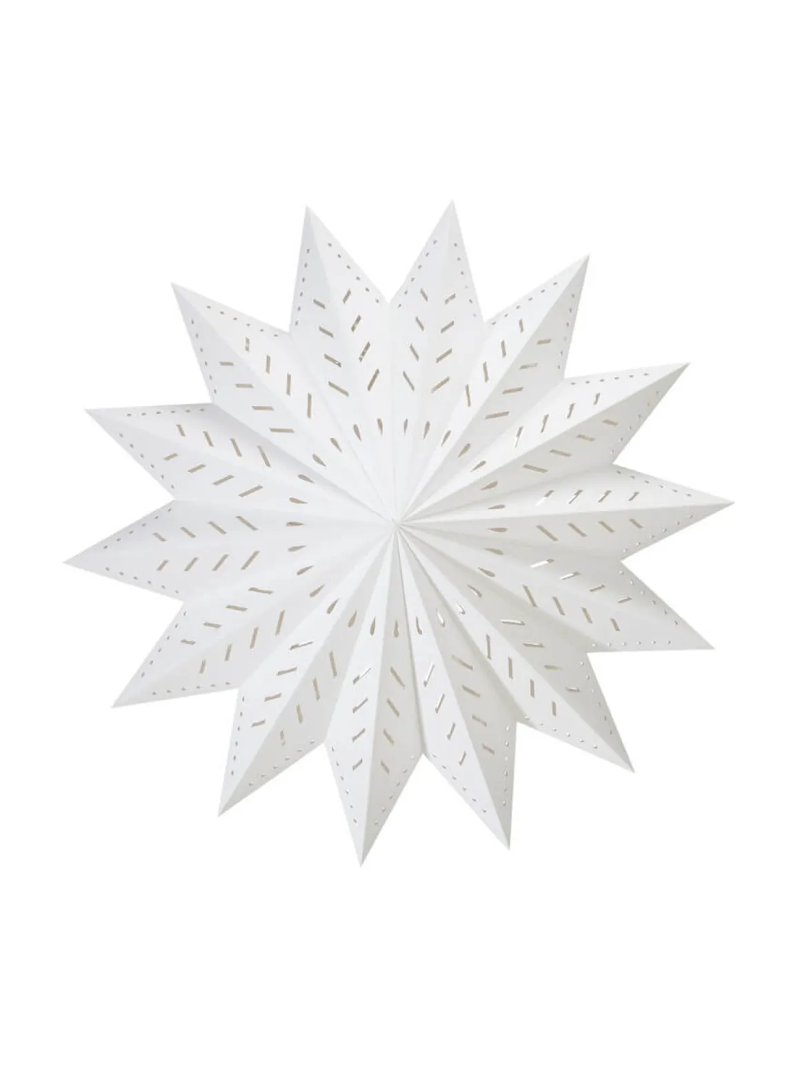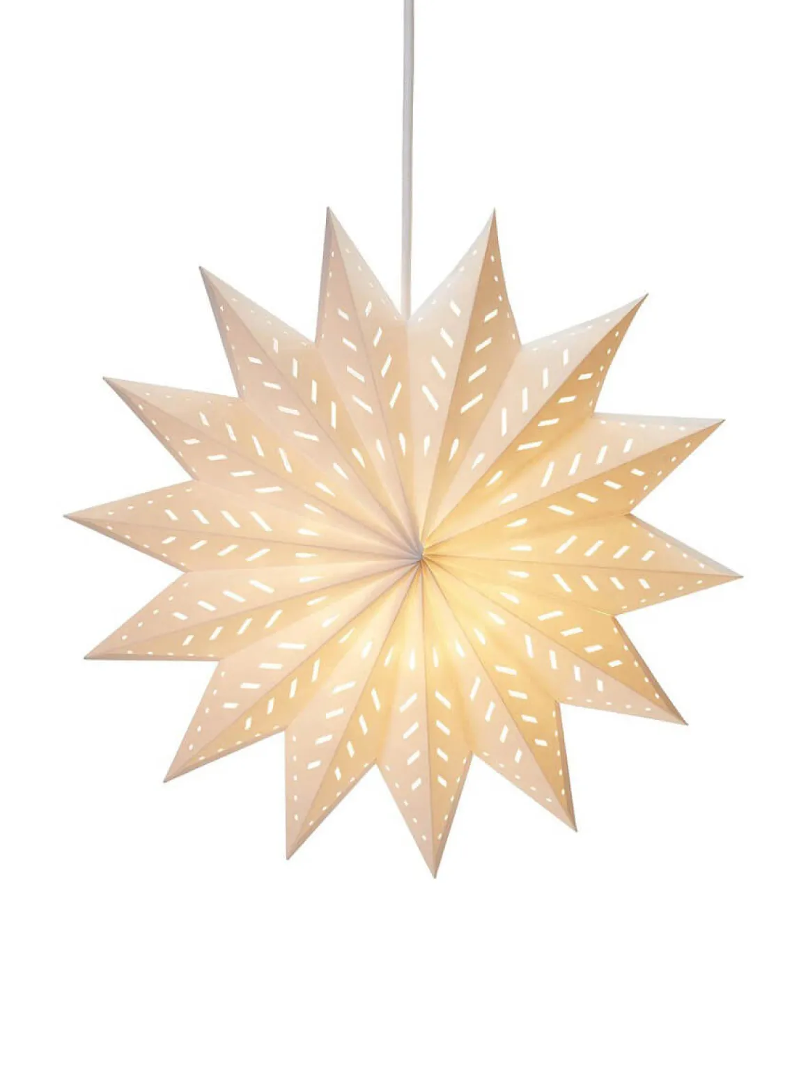 Julstjärna i Vitt papper av en lite kraftigare/tåligare kvalitet med stansade hål som släpper igenom ljuset på ett vackert sätt. Stängs med snöre och snörstopp. Glöm inte köpa till E14 sladdställ och ljuskälla, max 25W.