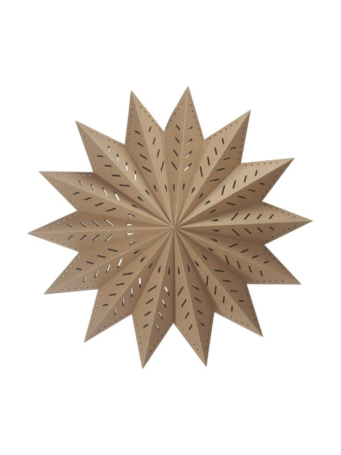 Stor Julstjärna (60 cm) i Brunt papper av en lite kraftigare/tåligare kvalitet med stansade hål som släpper igenom ljuset på ett vackert sätt. Stängs med snöre och snörstopp. Glöm inte köpa till E14 sladdställ och ljuskälla, max 25W. Höjd 50cm, bredd 50cm.