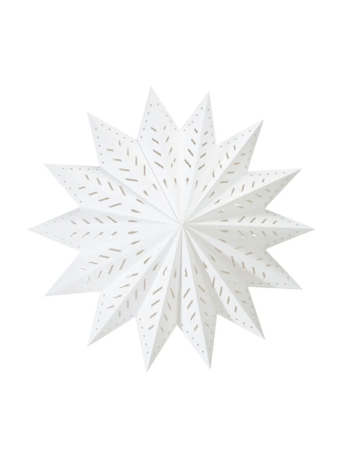 Stor Julstjärna (60 cm) i Vitt papper av en lite kraftigare/tåligare kvalitet med stansade hål som släpper igenom ljuset på ett vackert sätt. Stängs med snöre och snörstopp. Glöm inte köpa till E14 sladdställ och ljuskälla, max 25W.