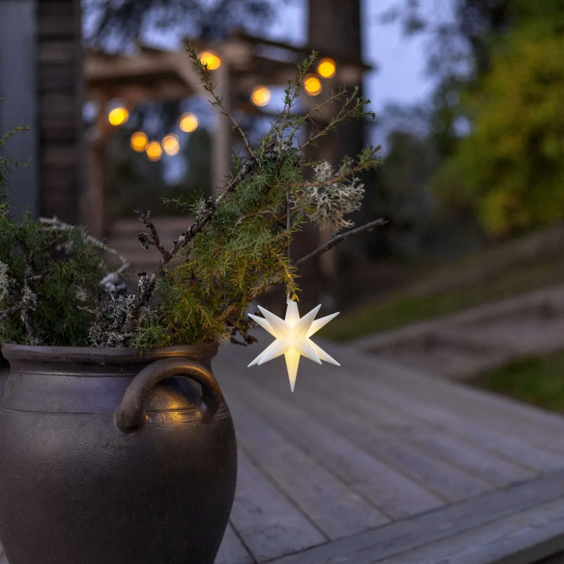 När julen får lov att flytta ut utanför hemmet till våra kanske vinterbonade uterum, eller trädet i trädgården då är Alice ett perfekt val! Läcker 3D stjärna som dessutom styrs med batteri för enkel installation både i hemmet och utanför. Alice finns även i en större batteridriven modell och i en jättestor eldriven variant för utomhus.