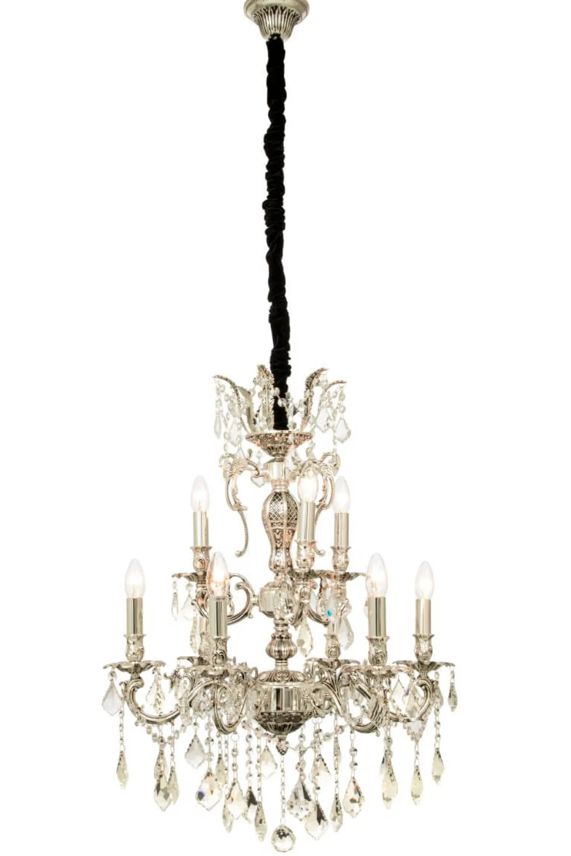 Wow, vackra Allington från Aneta belysning. En pampig kristallkrona med gnistrande K9 prismor omgivna av en stomme i borstad stål. Över kättingen sitter ett svart sammetstyg som lyfter kronan ytterligare och ger ett mjukt intryck.