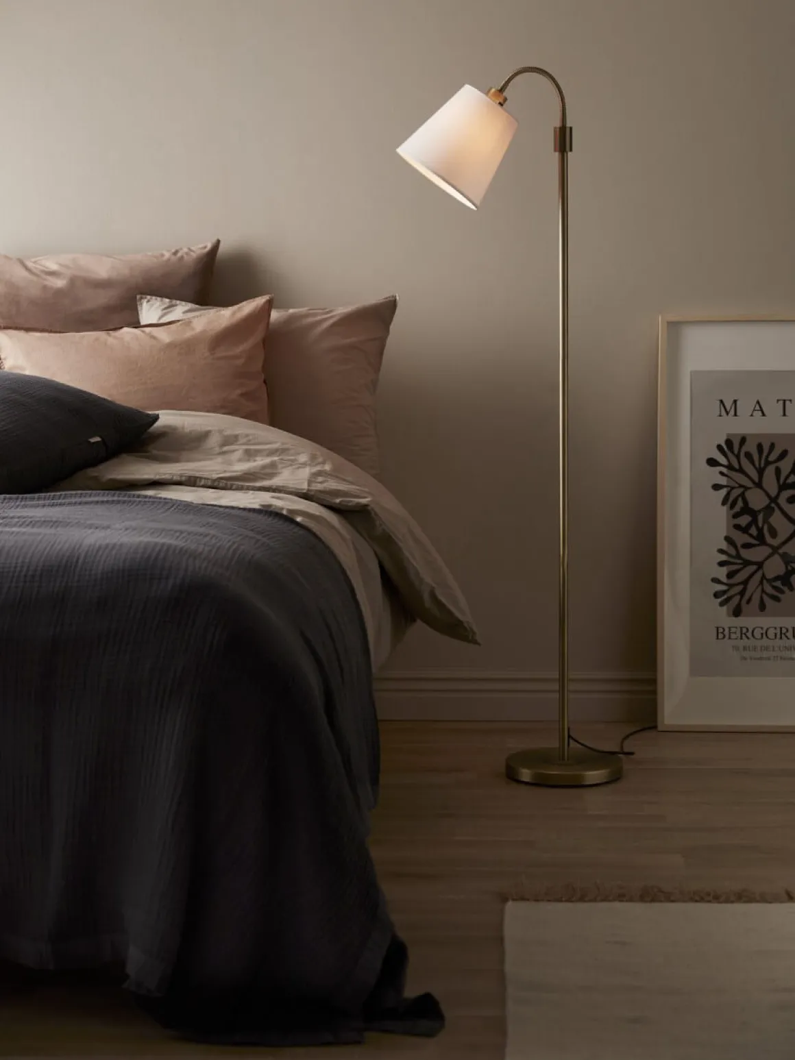 Golvlampa Amy i antikmässing från PR-Home. En strålande baslampa där strömbrytaren sitter på övre delen som har en E27 lamphållare med flexarm. Golvfoten passar med skärmar med E27 toppringsfäste men vilken modell av dem alla väljer du självklart själv.110 cm plastkabel med väggkontakt.