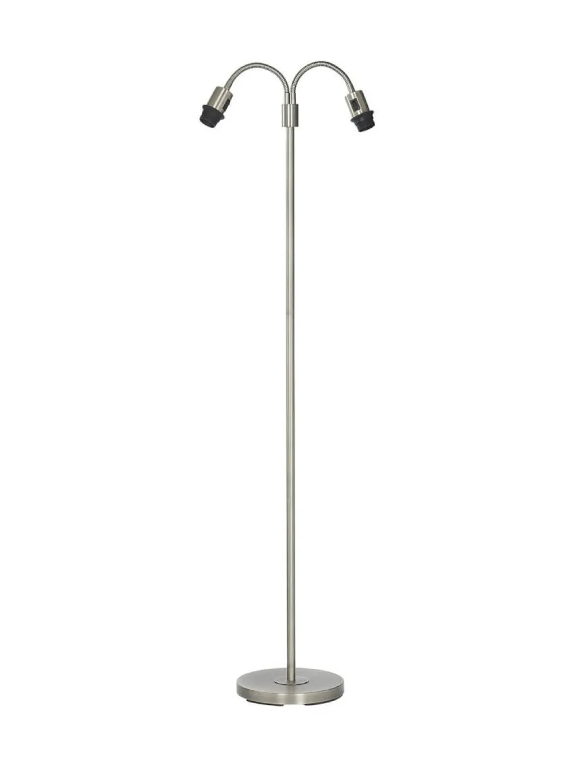 Golvlampa Amy i krom från PR-Home. En strålande baslampa där strömbrytaren sitter praktiskt placerad på de 2 lamphållarna med flexarm. Golvfoten passar med skärmar med E27 toppringsfäste men vilken modell av dem alla väljer du självklart själv.110 cm plastkabel med väggkontakt.