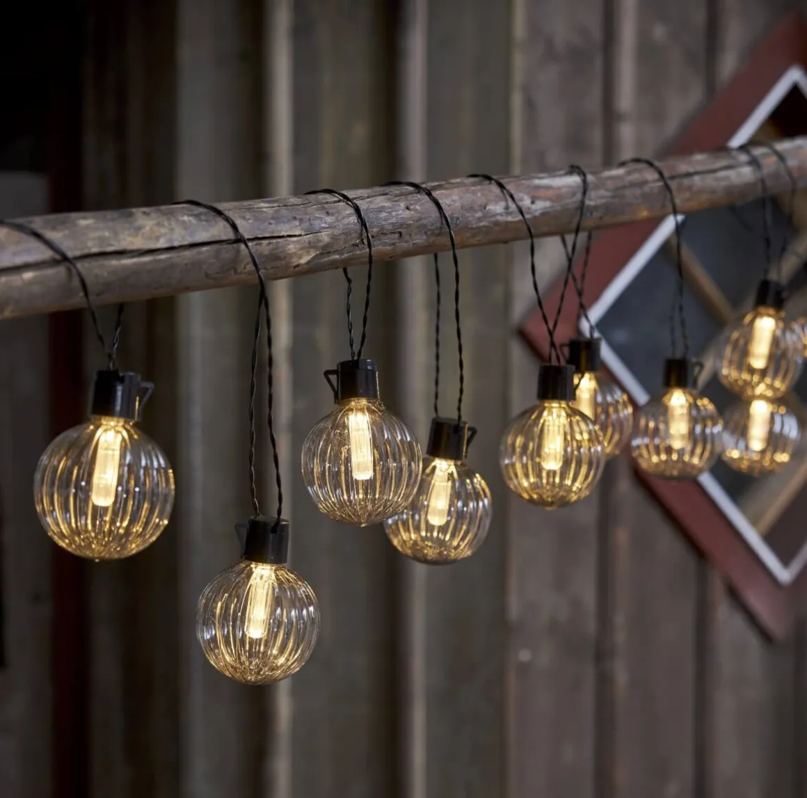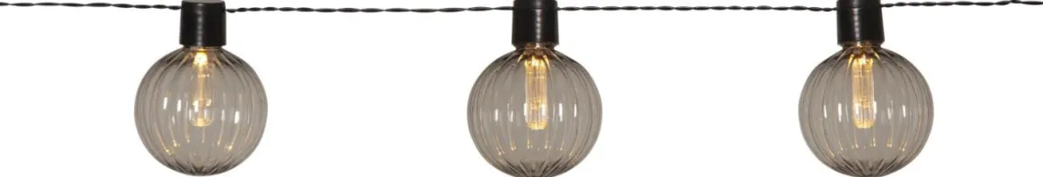 Snygg och dekorativ slinga för utomhusbruk från Star Trading. 10 stycken rökfärgade höljen med en räfflad yta som ger ett härligt ljussken. Dekorera uteplatsen eller din trädgård för en stämningsfull atmosfär.