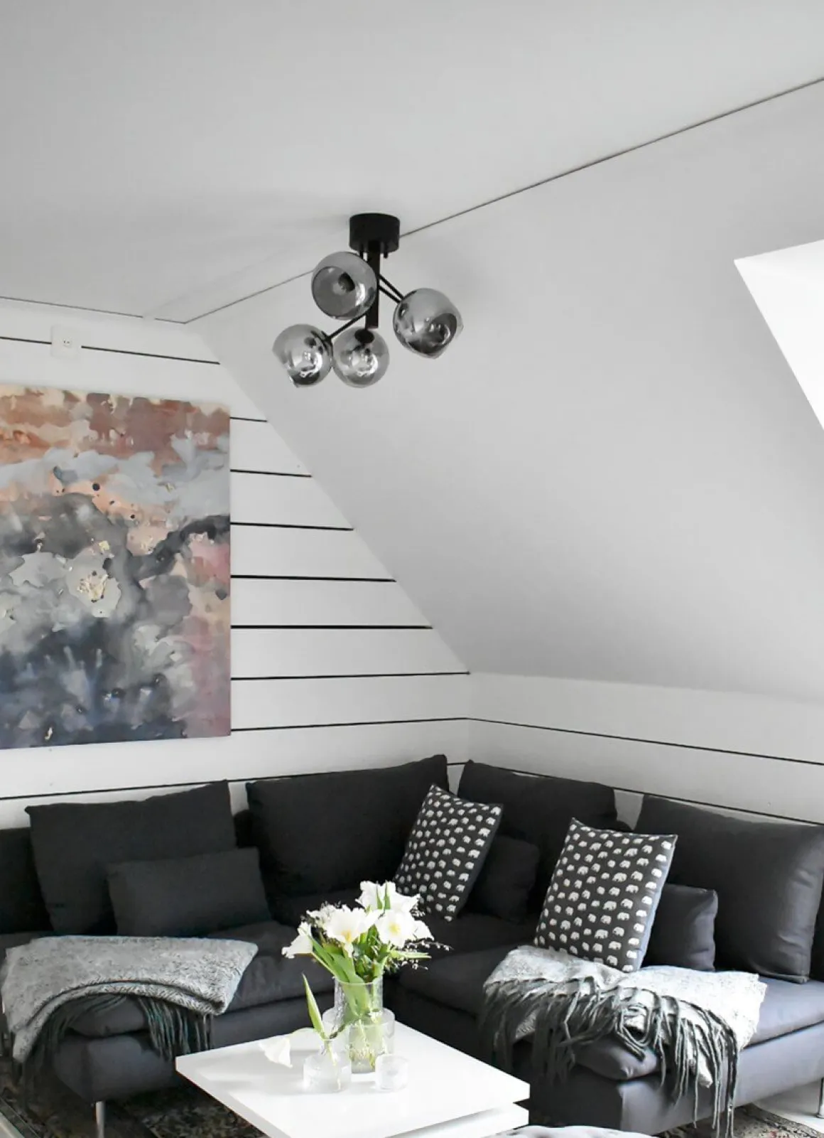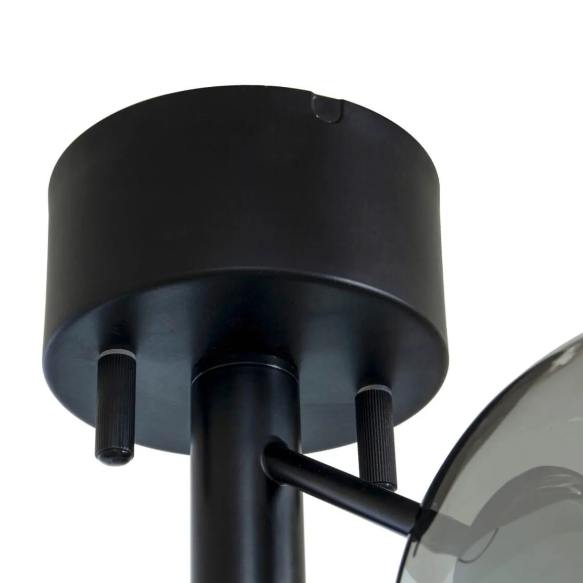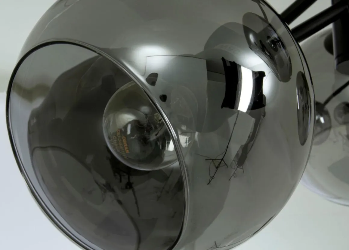 Ljuvliga Atom från Aneta, en modern golvlampa som ligger helt rätt i tiden med sin svarta stomme och rökfärgade kupor. Sätt din egna personliga touch på underverket i val av ljuskällor till din alldeles egna Atom.