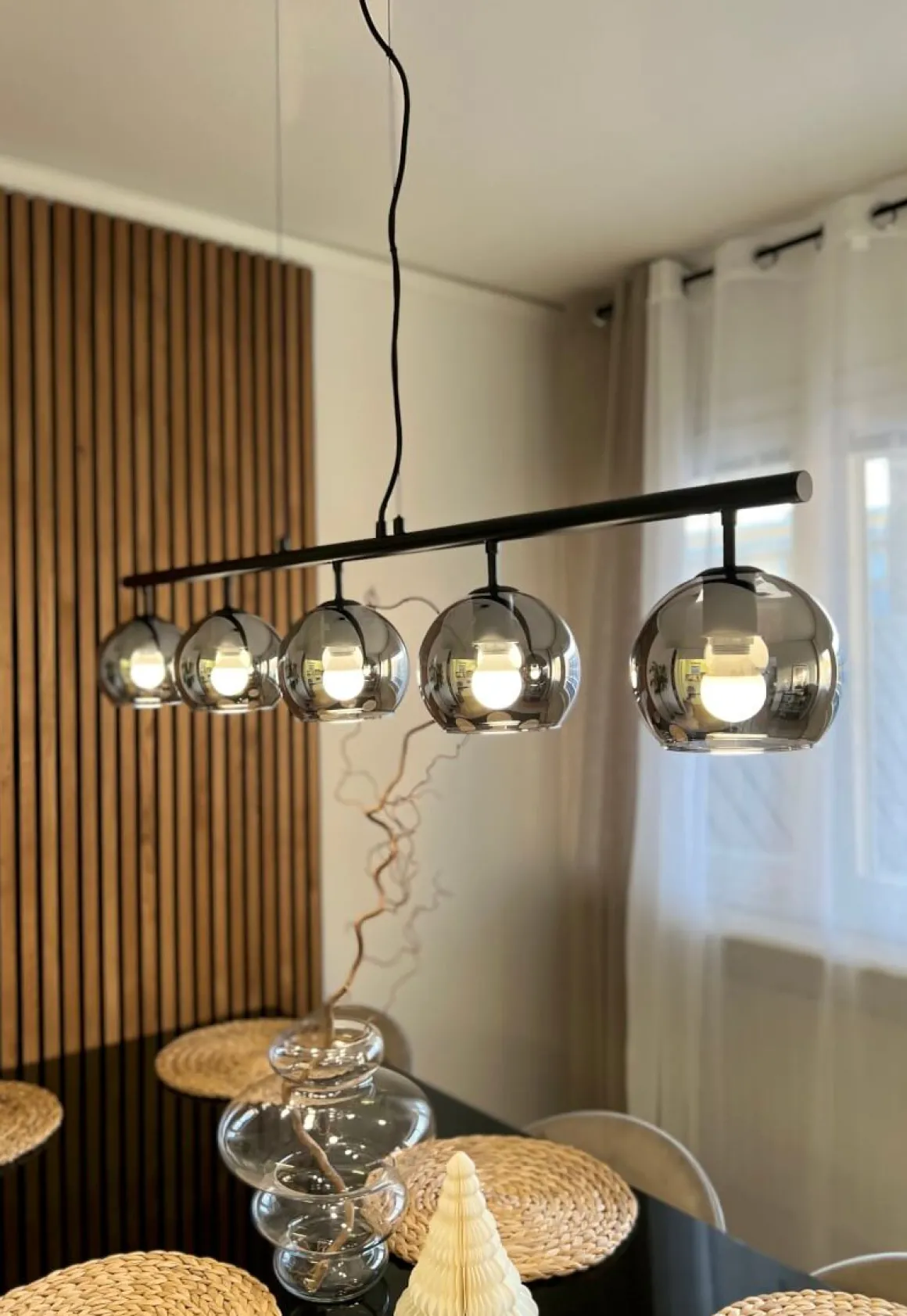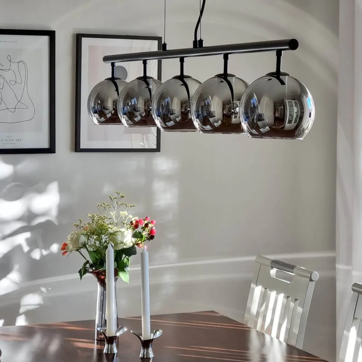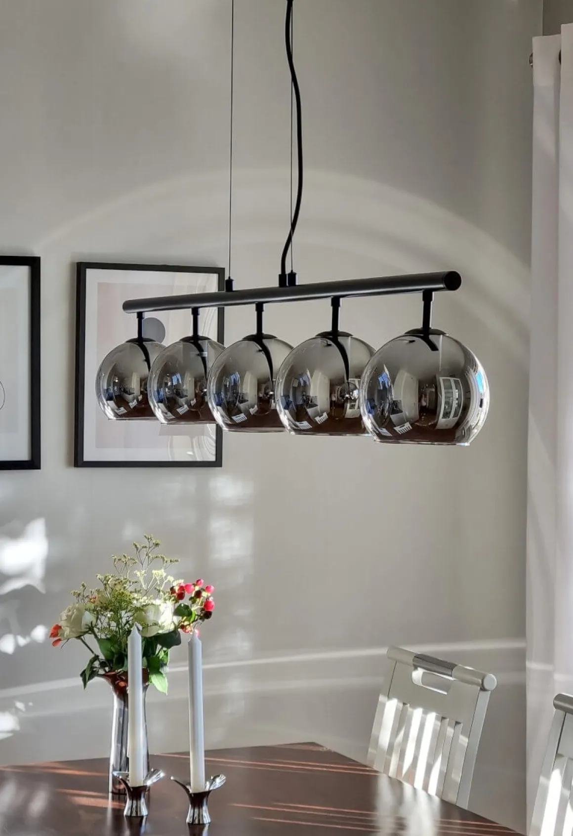 Atom från Aneta är en läcker serie lampor. Här är en modern taklampa med fem vackert rökfärgade glaskupor. Atom blir ett spännande inslag i inredningen oavsett om du placerar den över matbordet, soffbordet eller byrån. Lampan är självklart justerbar i höjd där minsta totalhöjd är 35 cm och högsta är 160 cm. Atom taklampa kan med fördel kombineras med andra lampor i Atom-familjen.