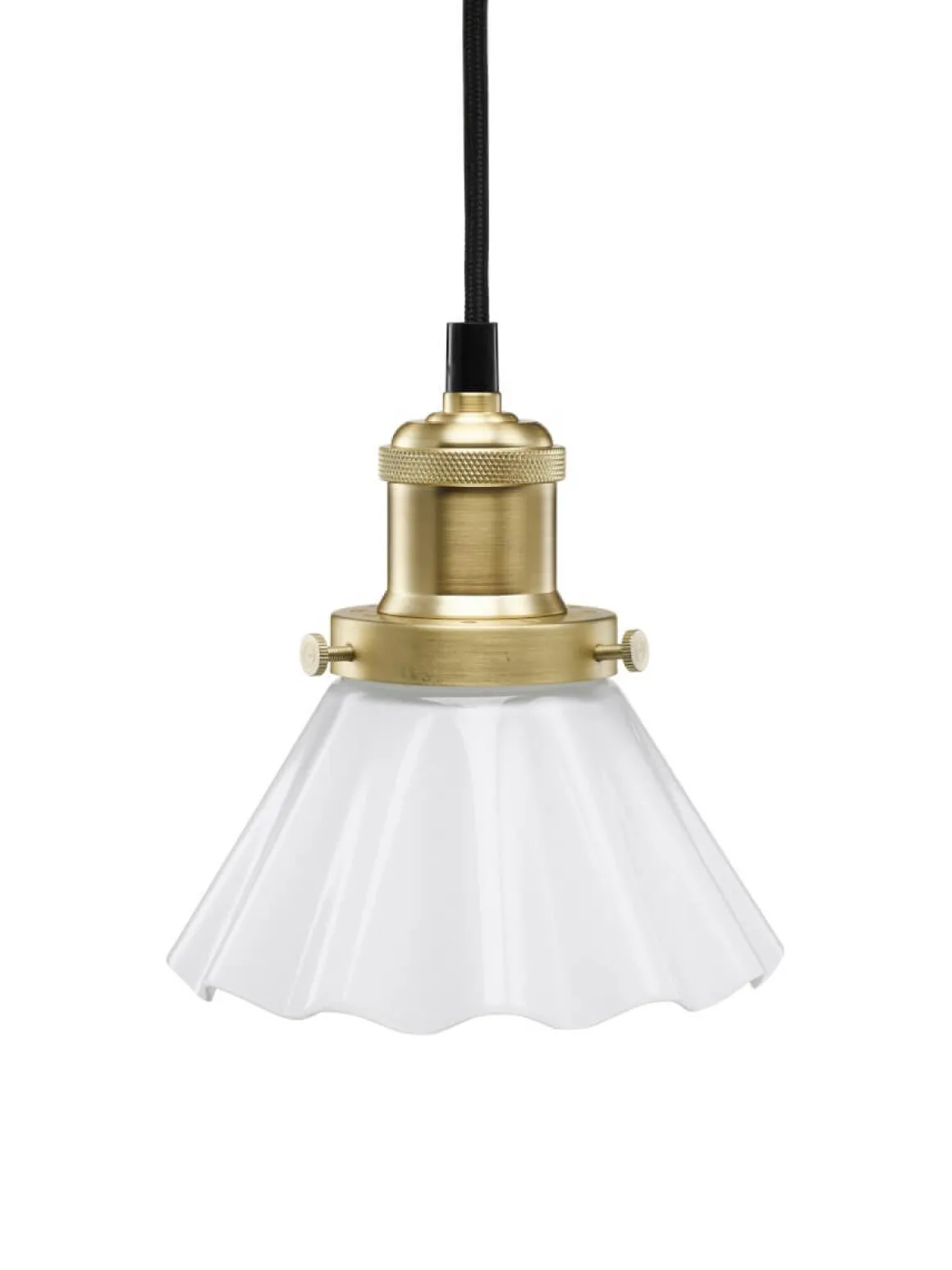 Denna klassikernas klassiker här ser du vackra skomakarlampan med ett läckert veckat opalvitt glas (15 Centimeter) kombinerat med ett upphäng med mässingsfinish med 3 meter svart textilkabel.