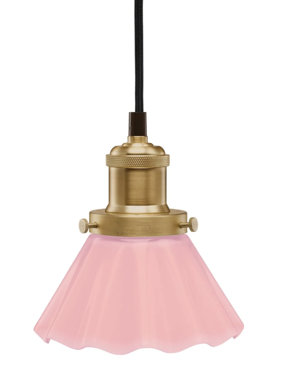 Denna klassikernas klassiker här ser du vackra skomakarlampan med ett läckert veckat rosa glas (15 Centimeter) kombinerat med ett upphäng med mässingsfinish med 3 meter svart textilkabel.