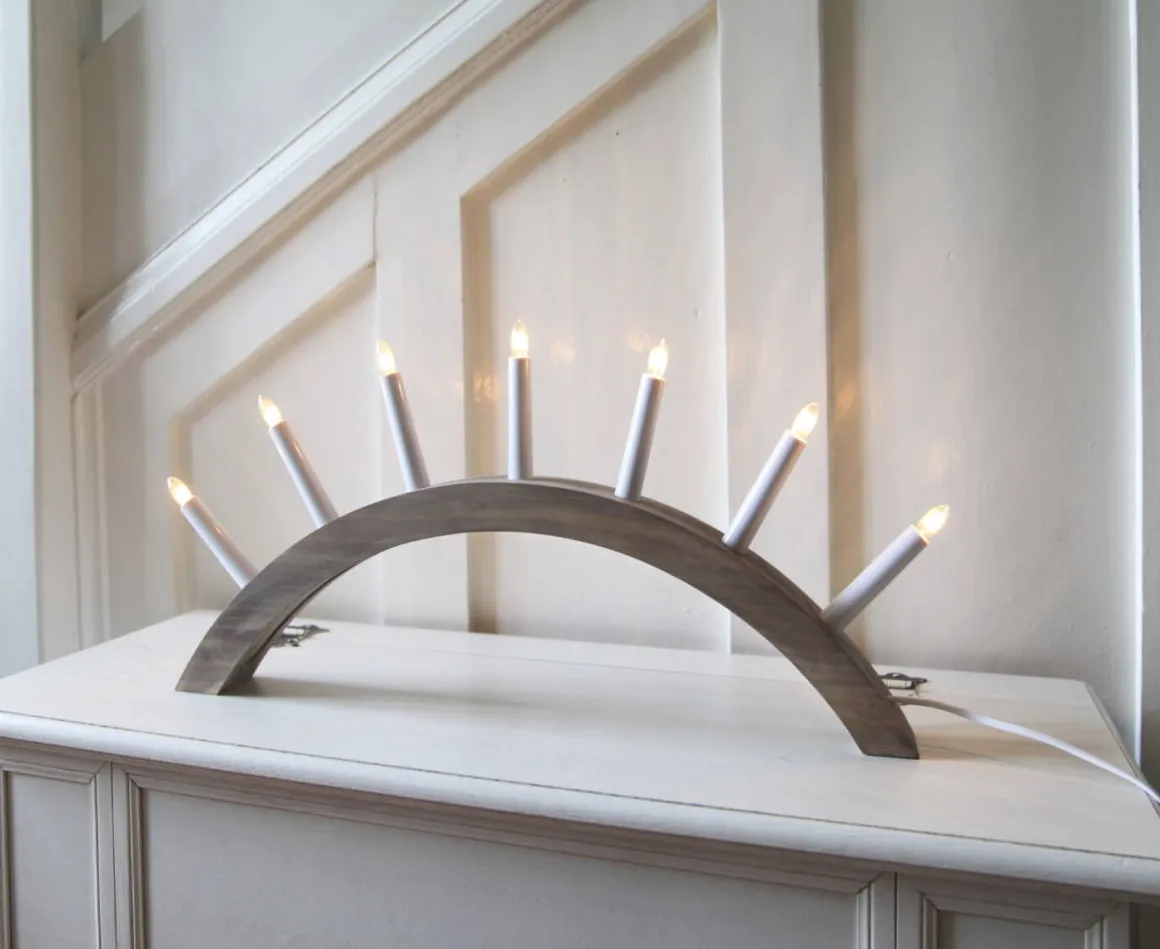 Brun stilren träljusstake med 7 ljuskällor från Star Trading. Ljusstaken är formad som en båge och ger ett elegant intryck i rummet. En dekorativ adventsljusstake som sprider julstämning i hemmet.