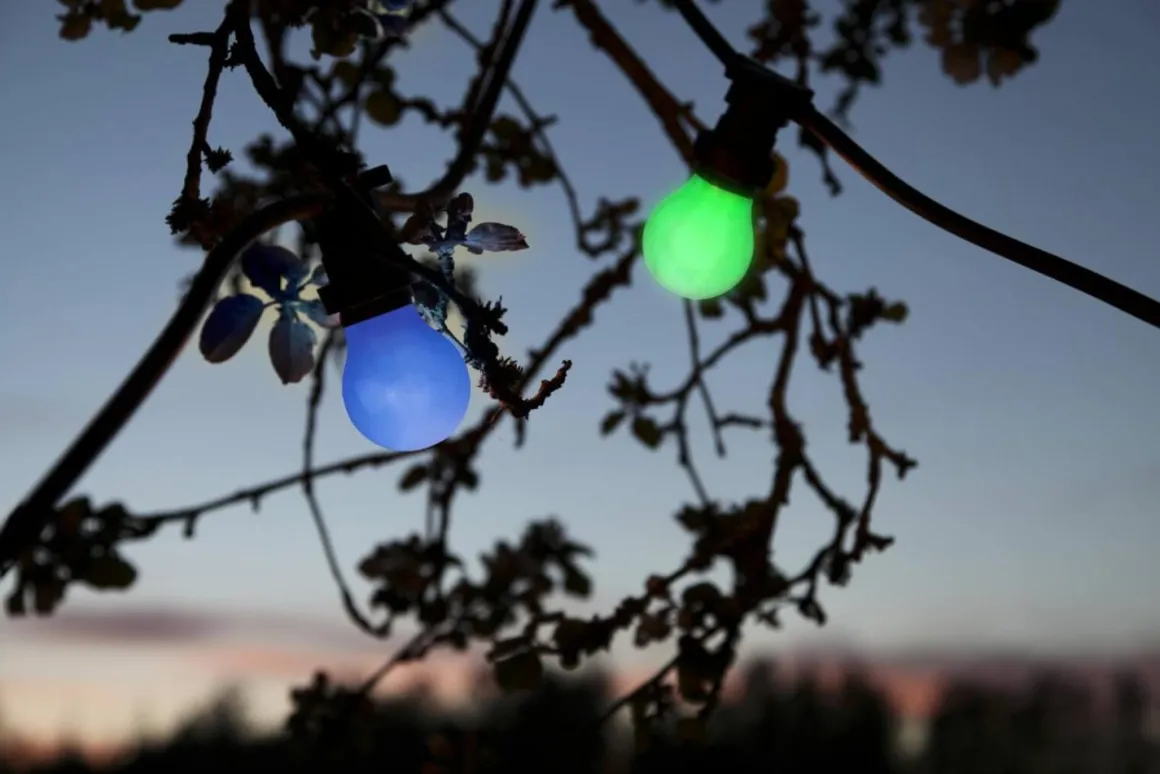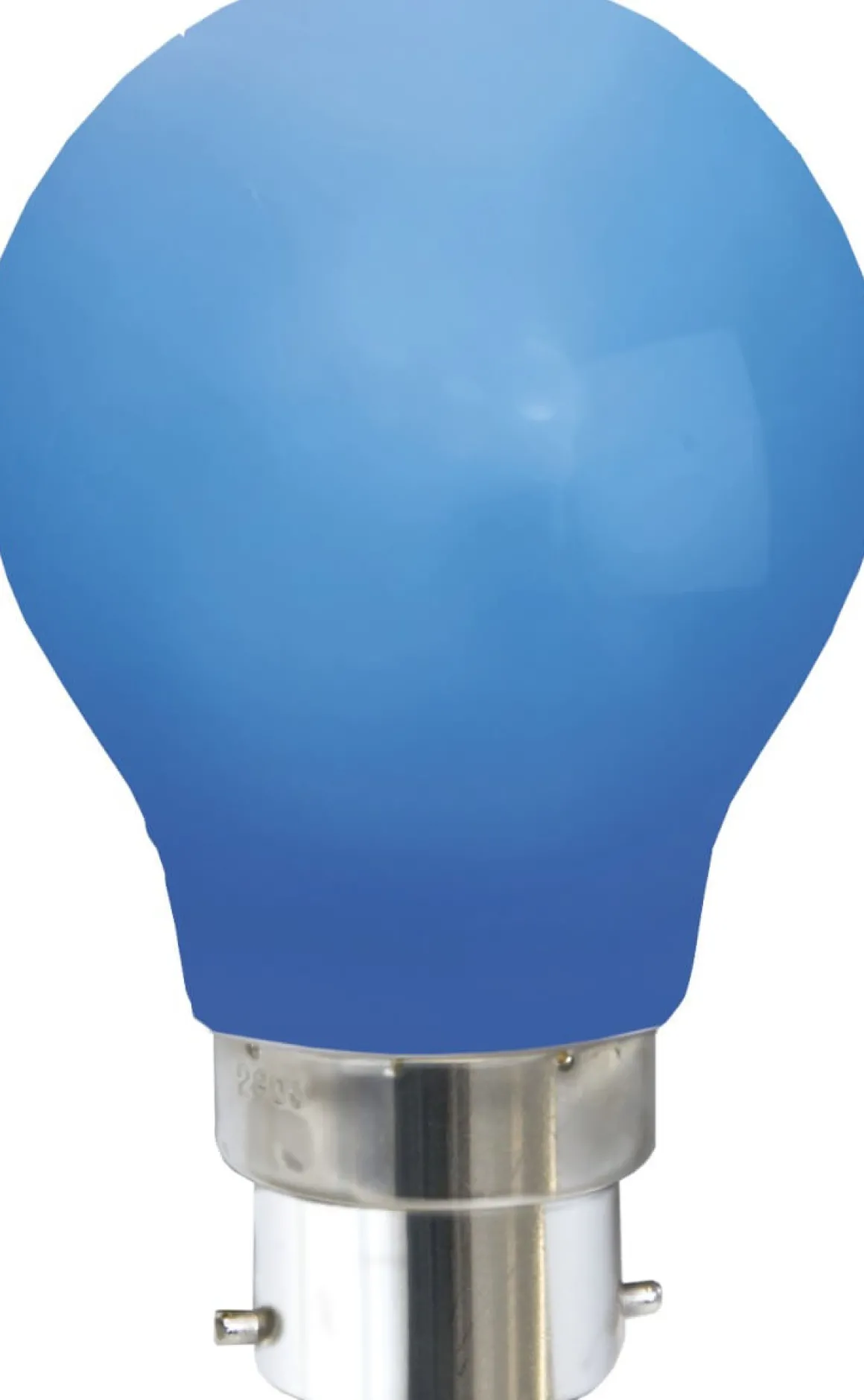 Färgad blå klotlampa med en B22 Sockel, passar perfekt till partybelysningen.