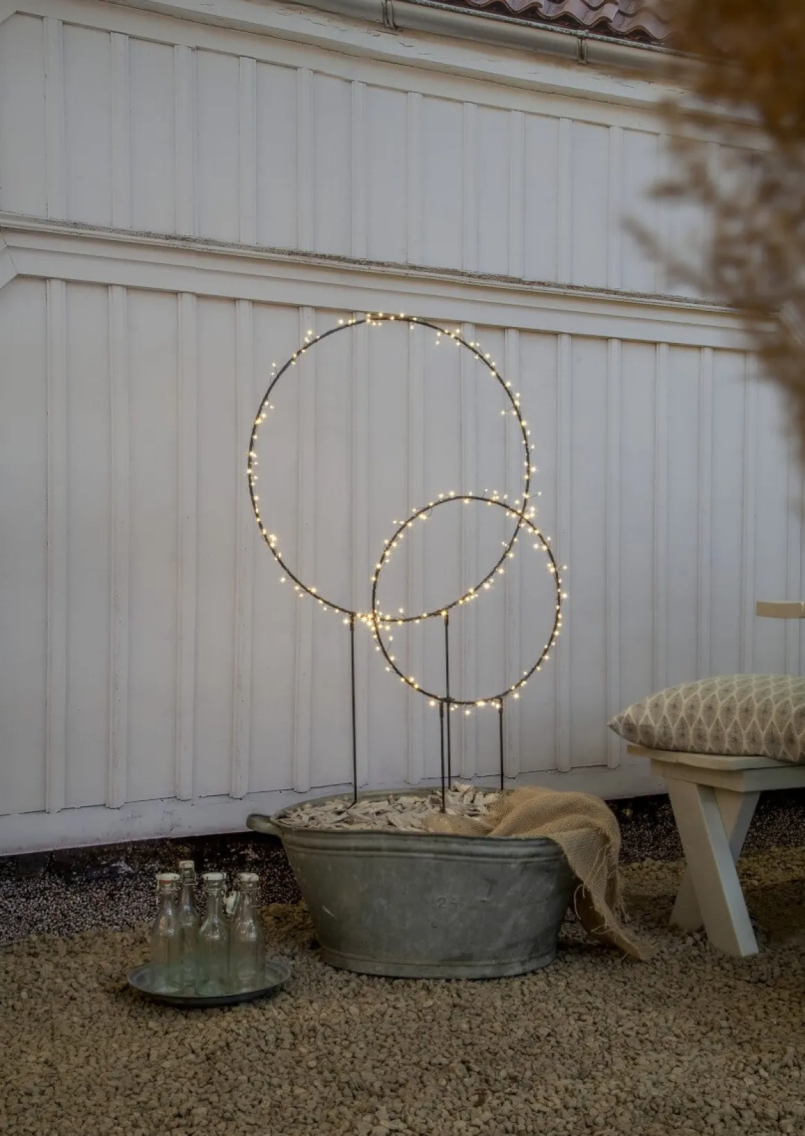 Så läcker siluett i form av en cirkel att montera utomhus i en kruka eller på friland (eller inomhus om du vill det) Här ser du Lilla Barlumi med hela 100 små varmvita ljuspunkter som lyser upp i mörkret.