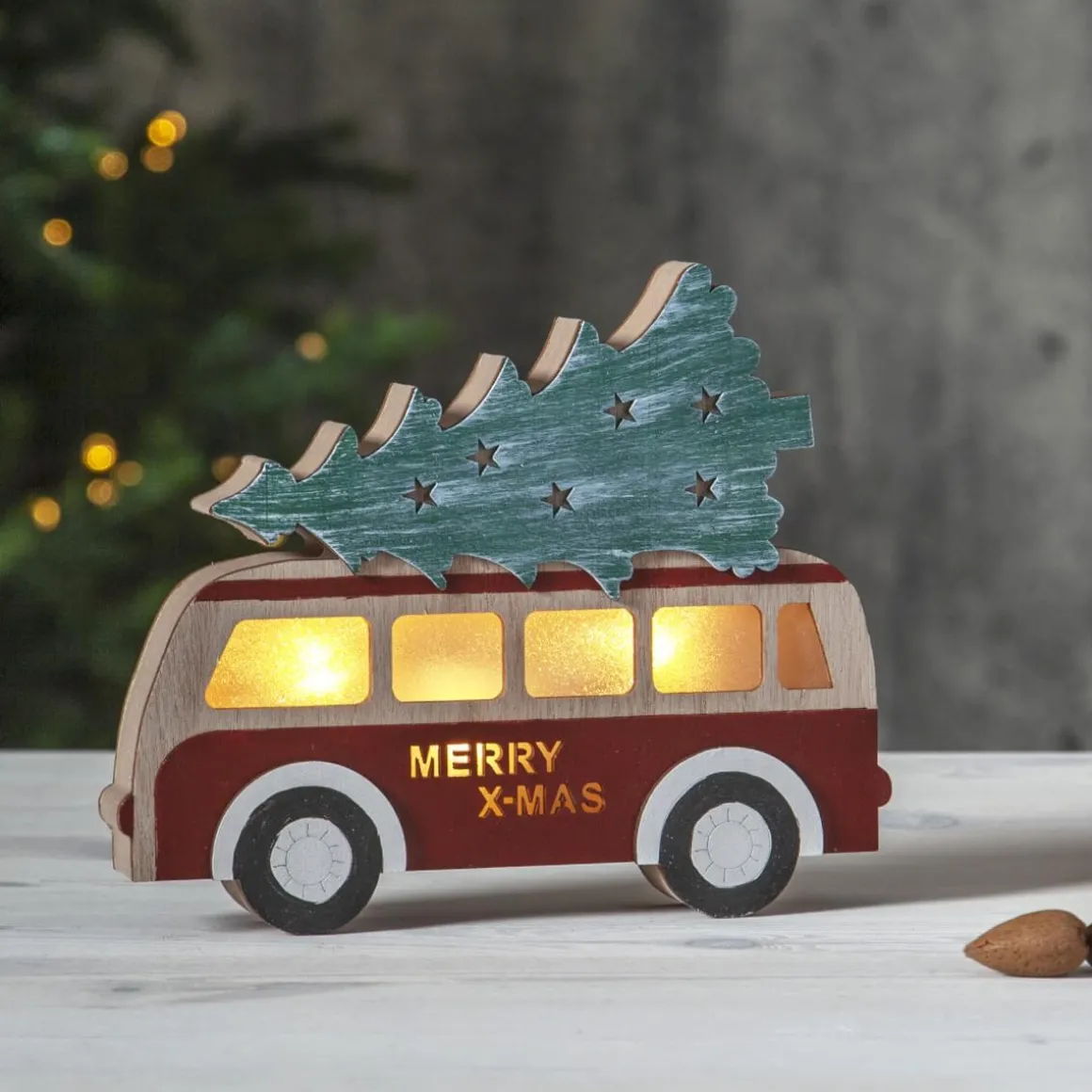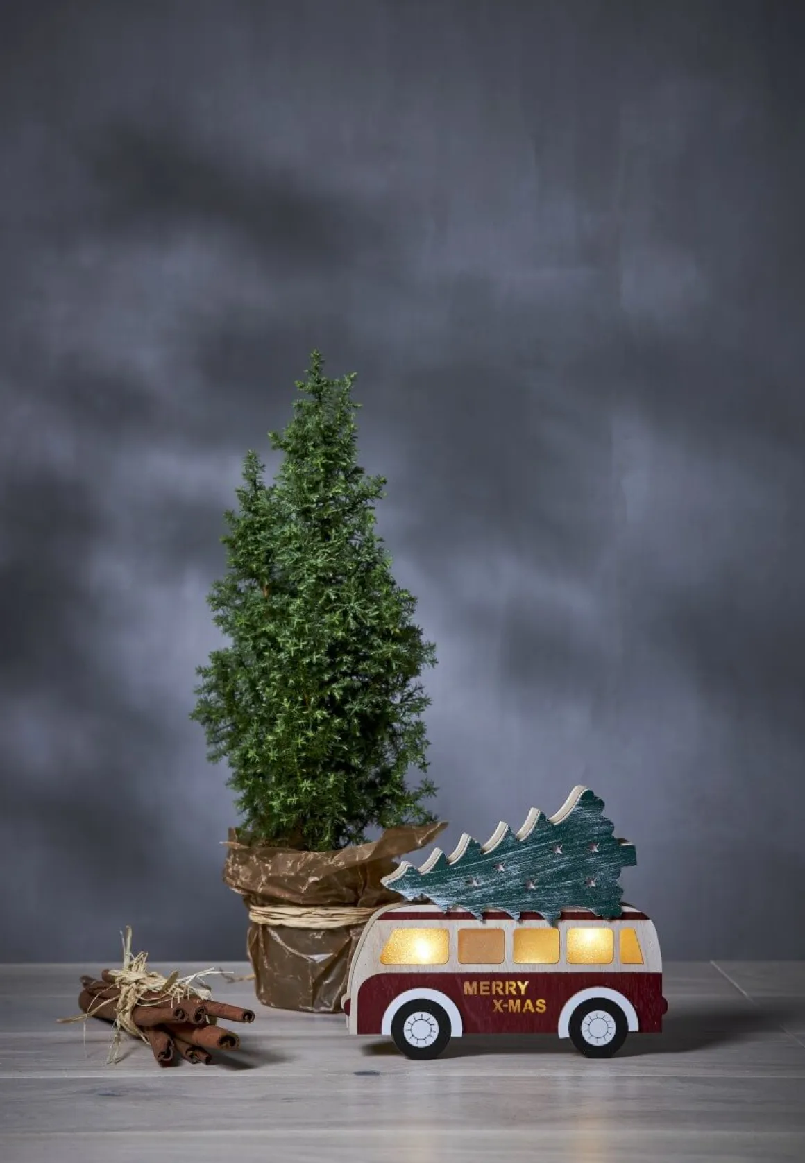 Läcker Buss med julgran på taket från Star Trading, dekorationen är tillverkad av trä. Dekorera barnrummet till julen och den lyser fint i fönstret och ger en mysig julstämning. Självklart med inbyggd timer.