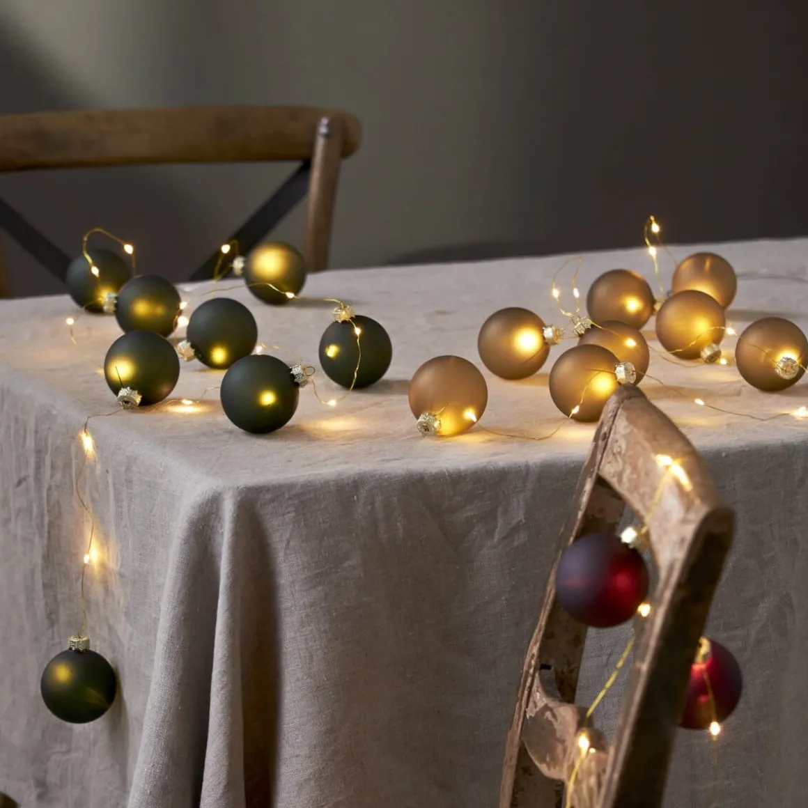 Vacker batteridriven ljusslinga med 8 st mörkt mattguldiga glaskulor från star trading. Den mässingsfärgade slingan lyser inte bara i kulorna utan även på slingan där emellan. Perfekt som bordsdekoration eller att hänga i den lilla bordsgranen. Slingan har självklart en timer så du enkelt själv kan ställa in när du vill att den ska lysa.
