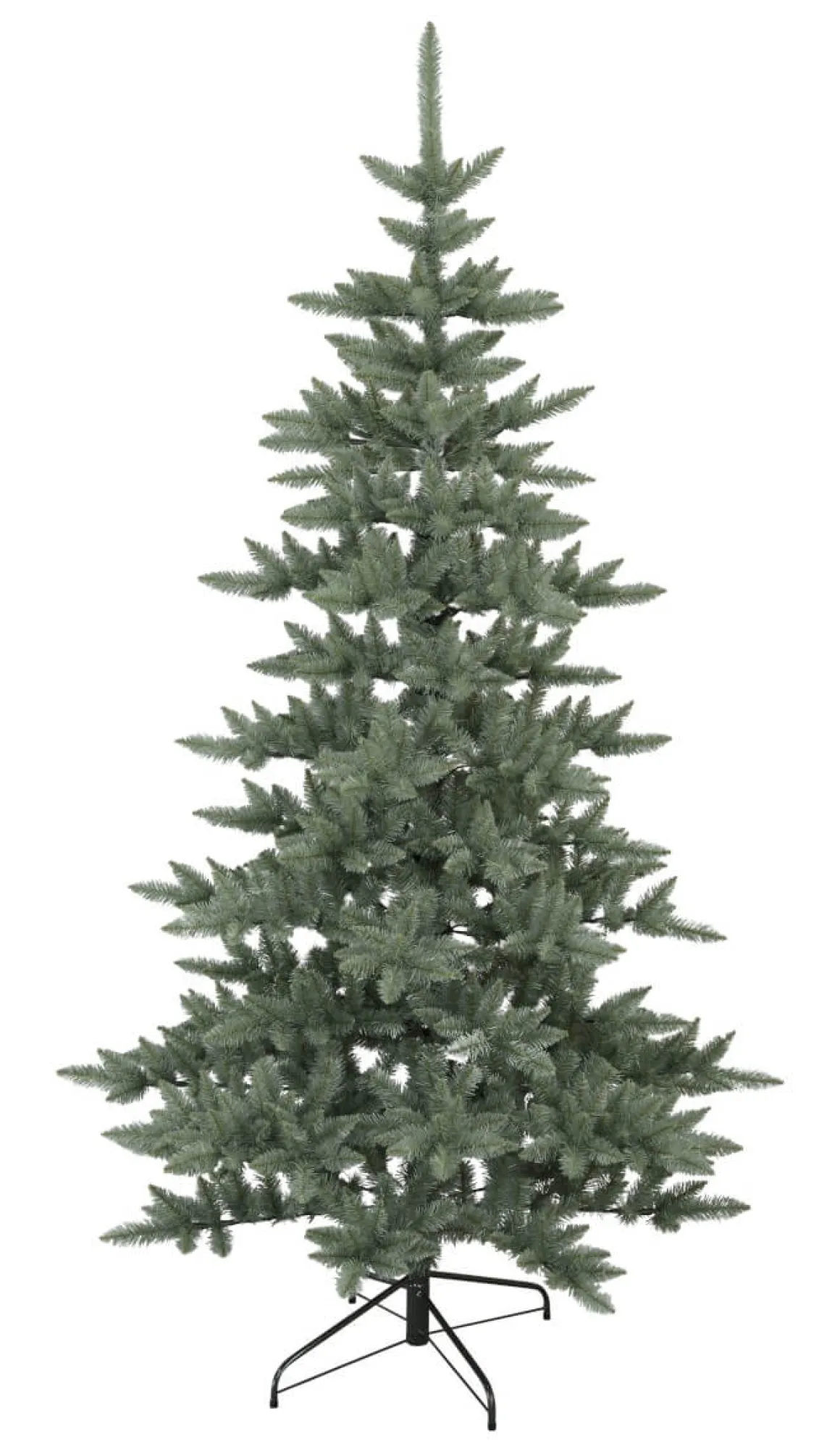 Vacker julgran med en höjd på 225cm som går att använda inomhus eller utomhus. Grenarna sitter fast vid stammen i gångjärn och fälls ned när man monterar granen. Easy peasy!