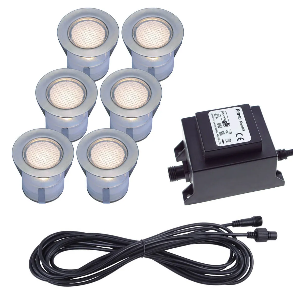 Komplett paket med 6 stycken små söta varmvita spottar från Bolthi, perfekt till trädäcket. Diameter 30mm med en borrdiameter på ca 23mm. I paketet ingår transformator, 5 meter anslutningskabel plus 2 x 65 cm kabel på varje lampa för vidarekoppling. Lamporna kopplas enkelt ihop med varandra med ett maxavstånd på 130 cm om du inte köper till extra kabel då vill säga 😉 önskar du fler än 6 stycken så går det koppla upp till 18 stycken spottar på den transformatorn som medföljer.