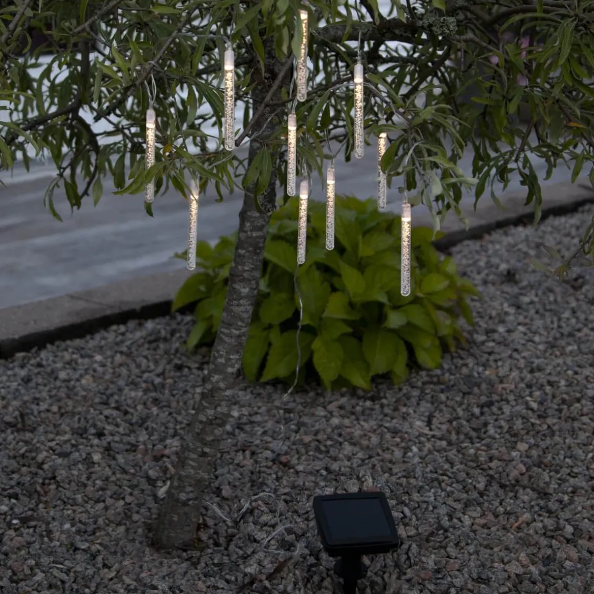 Kolla in denna läckra solcellsdrivna slingan Bubbly från Star Trading med 10 akryl pinnar med små bubblor i som lyser upp i mörkret med ett varmvitt behagligt sken igenom den bubbliga akrylen. Denna solcellsbelysningen har 20 cm mellan ljuspunkterna som ger en totalt 180cm lång slinga. Själva solpanelen sitter med 2 meters kabel från den sista pinnen, detta gör det enkelt att placera panelen i direkt solljus vilket är nödvändigt för att ladda batteriet som medföljer.
