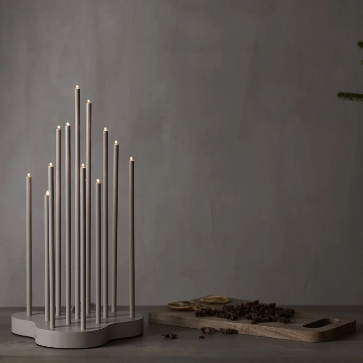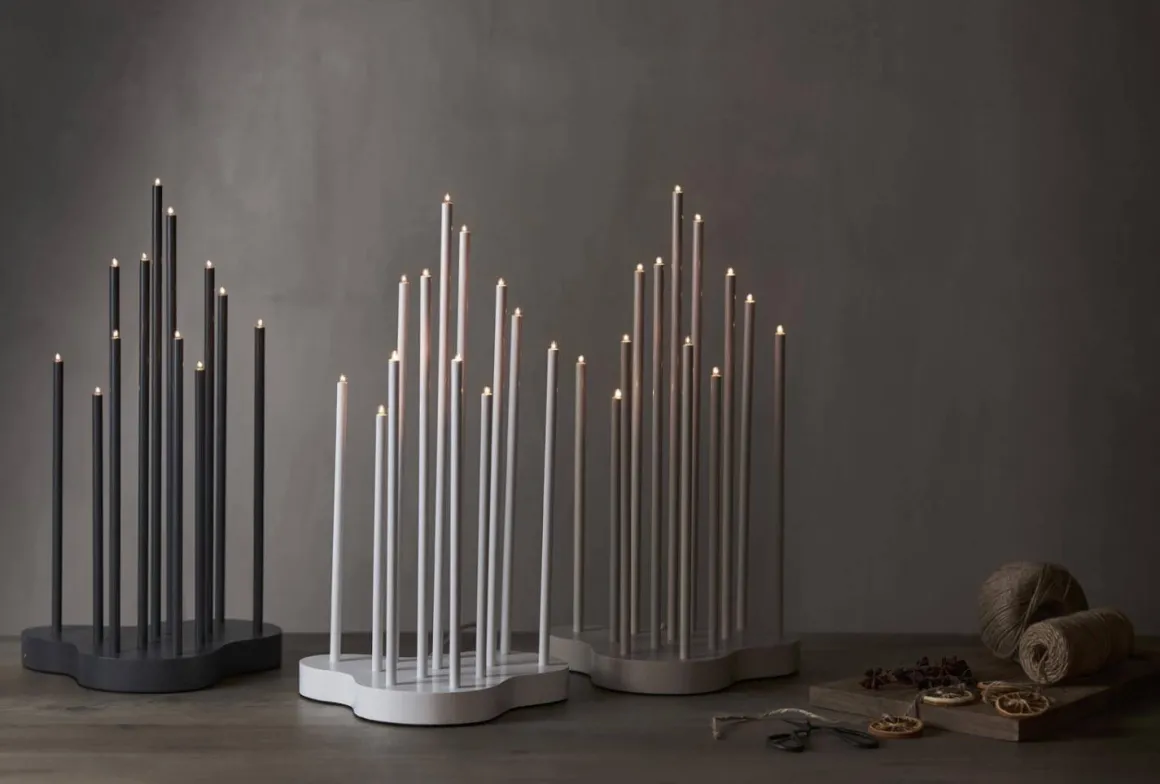 Vi har stor efterfrågan på denna typen av ljusstakar så håll till godo med denna vackra nyheten från Star Trading i färgen elephant (beige). Stilren ljusstake med kraftig bas i trä, ljuspipor av tunna metallrör. 12 stycken små E5 ljuskällor. Hela ljusstaken i grafitgrå färg – enhetligt och snyggt. Textilkabel i vitt/grå adderar lite extra lyx. Ger ett härligt stämningsfullt mysigt ljus hela året runt.
