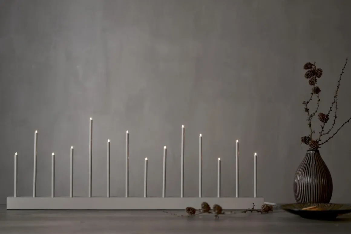 A ja ja och välkommen säger vi till denna härliga ljusstake från Star Trading. Buzz har en långsmal bas i trä med 14 stycken små E5 lampor. Buzz passar lika bra i ett långsmalt fönster som i en bokhylla eller varför inte på tv-bänken? Här ser du Buzz i beige.