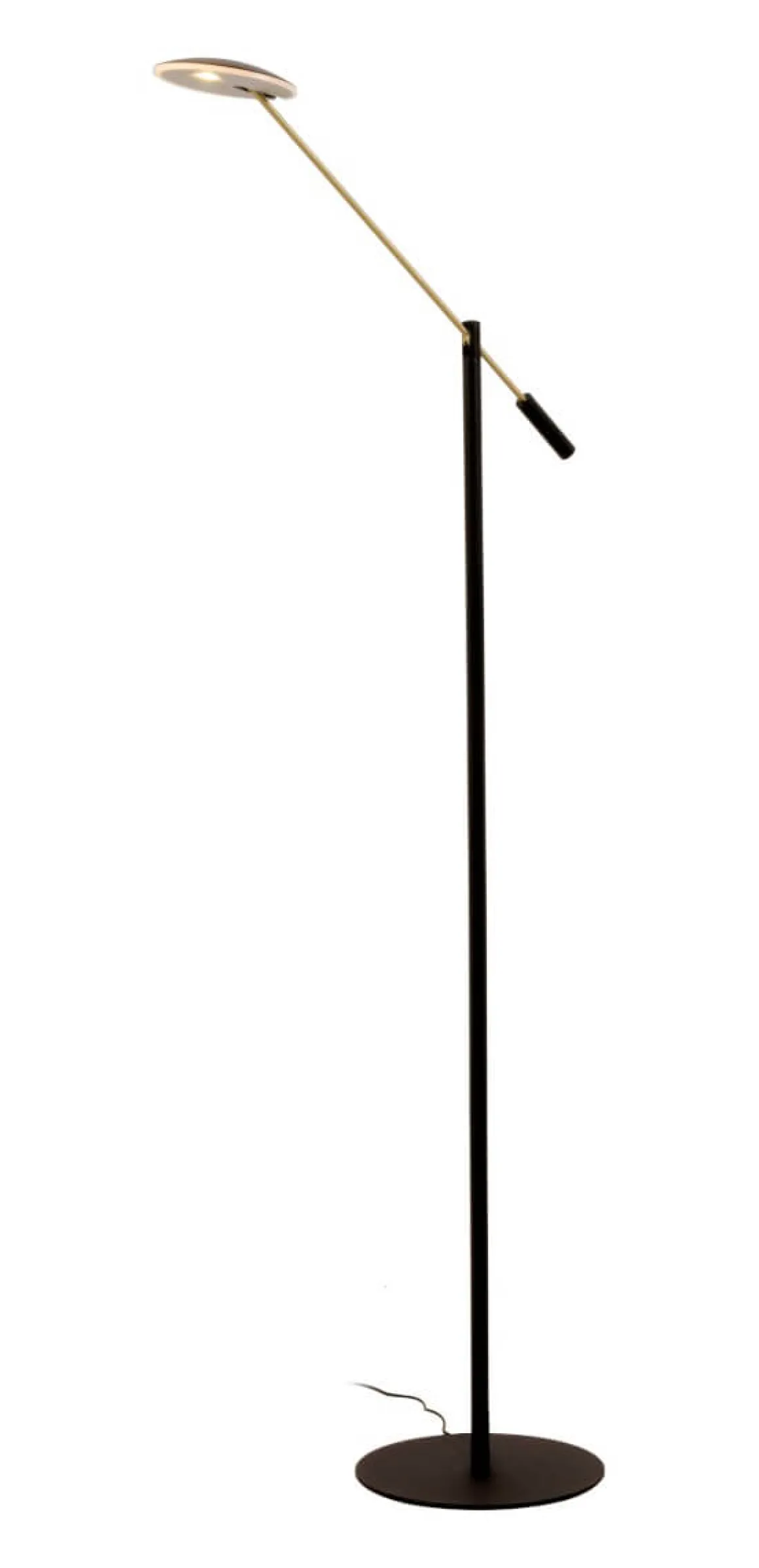 Cadiz golvlampa i kombinationen svart/mässing. Cadiz har en liten frostad yta över ljuskällan som gör att du får en något bredare ljusbild, perfekt om du ska läsa en tidning eller lösa korsord i favoritfåtöljen.