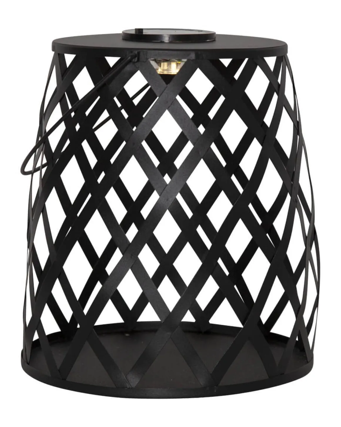 Solcellslykta 28 centimeter i svart metall från Star Trading med läckert romb mönster som laddas upp av solen under dagen och lyser med 20 Lumen när det är mörkt. Kolla bara så läckert ljussken den bildar när den är tänd.