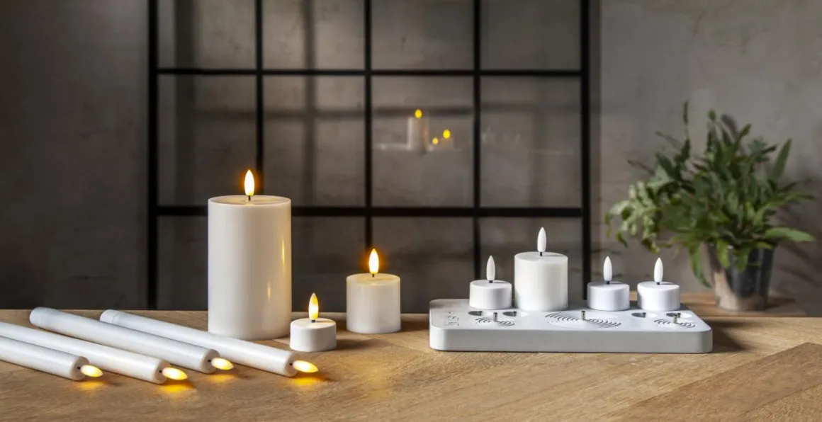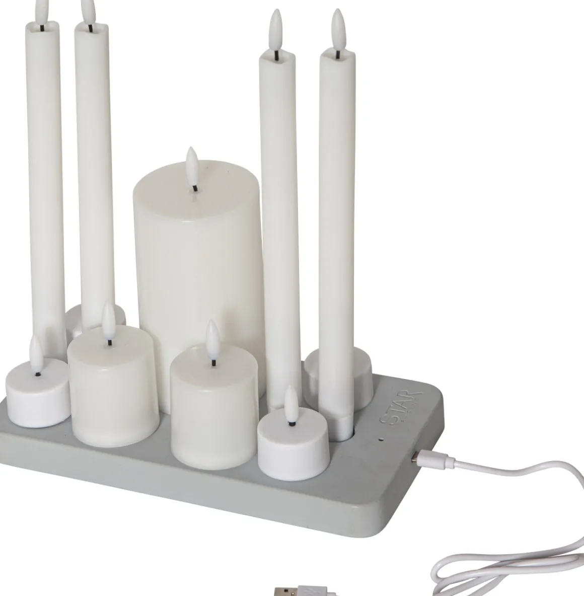 Flamme Charge är ett set med ljus i olika storlek som är uppladdningsbara från Star Trading. I setet ingår: 4st värmeljus 4x5cm, 4st antikljus 2x26cm, 2st votivljus 5x8cm och 1st blockljus 7,5x15cm. Den tillhörande laddningsplattan har även en medföljande 80cm lång kabel med USB A-USB C kopplingar som enkelt går att kopplas in i en 5V adapter, adaptern ingår inte. Indikationslampan i varje ljus lyser röd under laddning och grön när ljuset är färdigladdad. Även om litium batterierna har överladdningsskydd så Låt EJ ljusen ladda längre än 5 timmar max! När de är nya räcker det med en laddning på max 2 timmar.