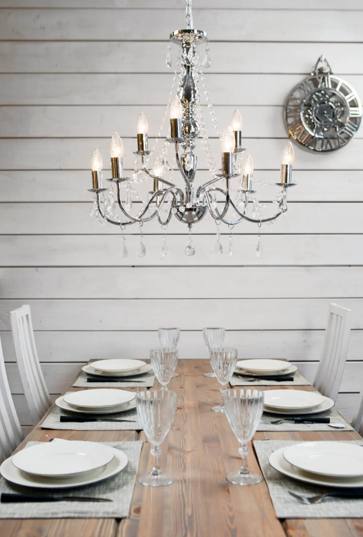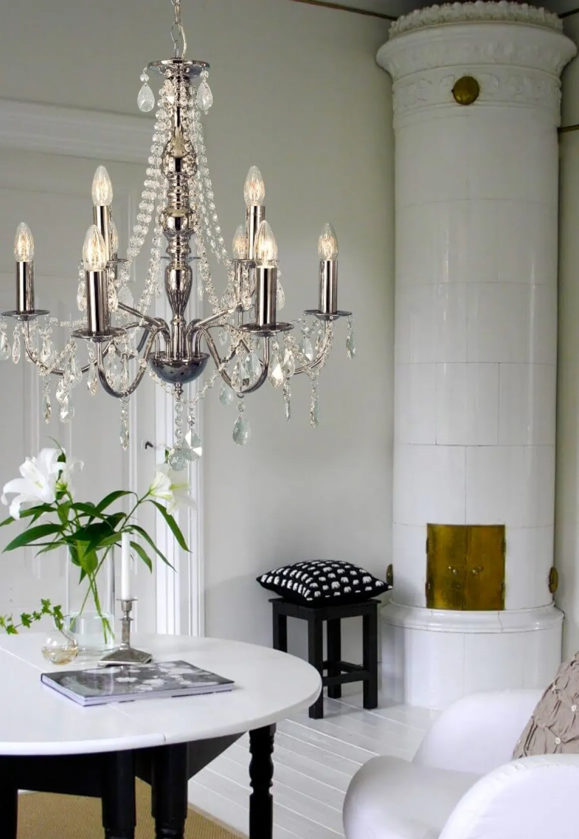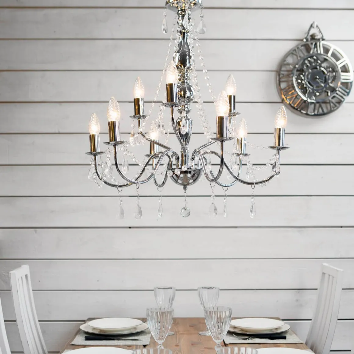 Gör dig redo för att känna dig som en kung eller drottning med Chateau-takkronan! Med sina nio armar kommer denna kromglänsande skönhet att ge ditt hem den elegans och glamour det förtjänar. Det är som att ha din egen lilla palatsbalsal där du kan bjuda in dina vänner på en festlig middag eller bara njuta av din favoritmusik medan du ligger på soffan. Så om du vill ha lite kunglig glans i ditt liv, tveka inte att skaffa Chateau-takkronan idag!
