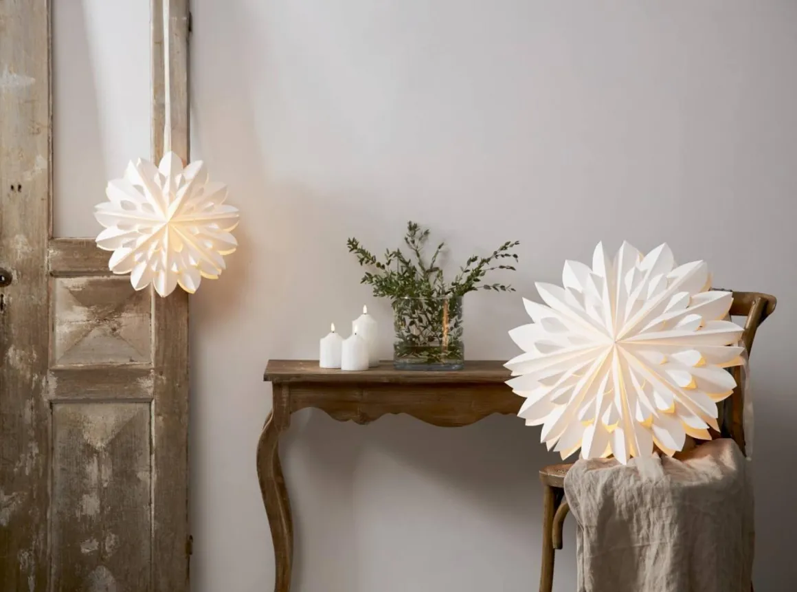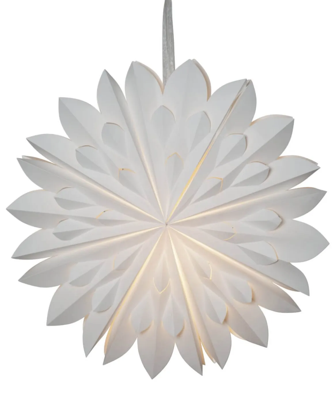 Stilfull och enkel vit pappersstjärna 60 centimeter från Star Trading. Ett elegant band ingår för att lättare kunna hänga upp stjärnan. Stjärnan sprider härlig stämning och ger hemmet den där speciella julkänslan. Kan hängas både i fönster och mot en vägg.