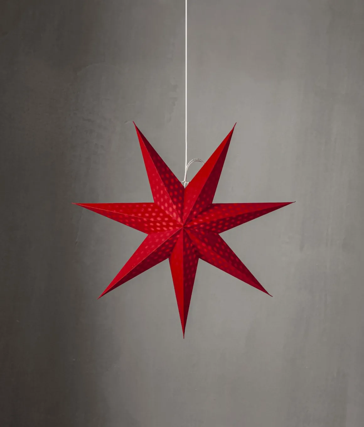 Magisk adventsstjärna som är tillverkad av papper från återvunnet bomullsspill från t-shirt tillverkning. Vattenstämplat mönster i form av prickar lyser genom pappret. Stjärnan sprider stämning och ger hemmet den där speciella advent och julkänslan. Kan hängas både i fönster och mot en vägg. Sladdställ ingår ej