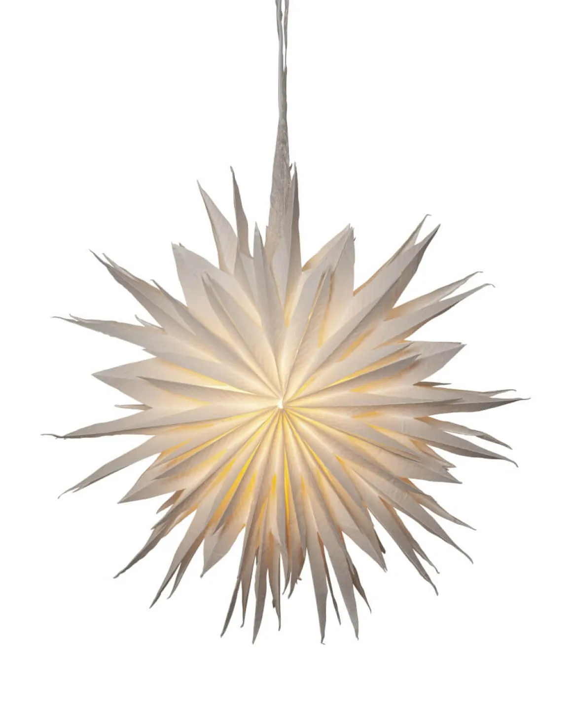 Underbart vacker pappersstjärna som är tillverkad av två lager veckat papper från Star Trading. Pappret är tillverkat av återvunnen bomullsspill från t-shirt tillverkning. Strukturen i pappret blir därför mjukt och i själva pappret ser man vattenstämplade ränder. Konturen är flikig för en vintrigare känsla. Ett elegant band ingår för att lättare kunna hänga upp stjärnan. Stjärnan sprider stämning och ger hemmet den där speciella advent ochjulkänslan. Kan hängas både i fönster och mot en vägg. Sladdställ och ljuskälla köpes separat.