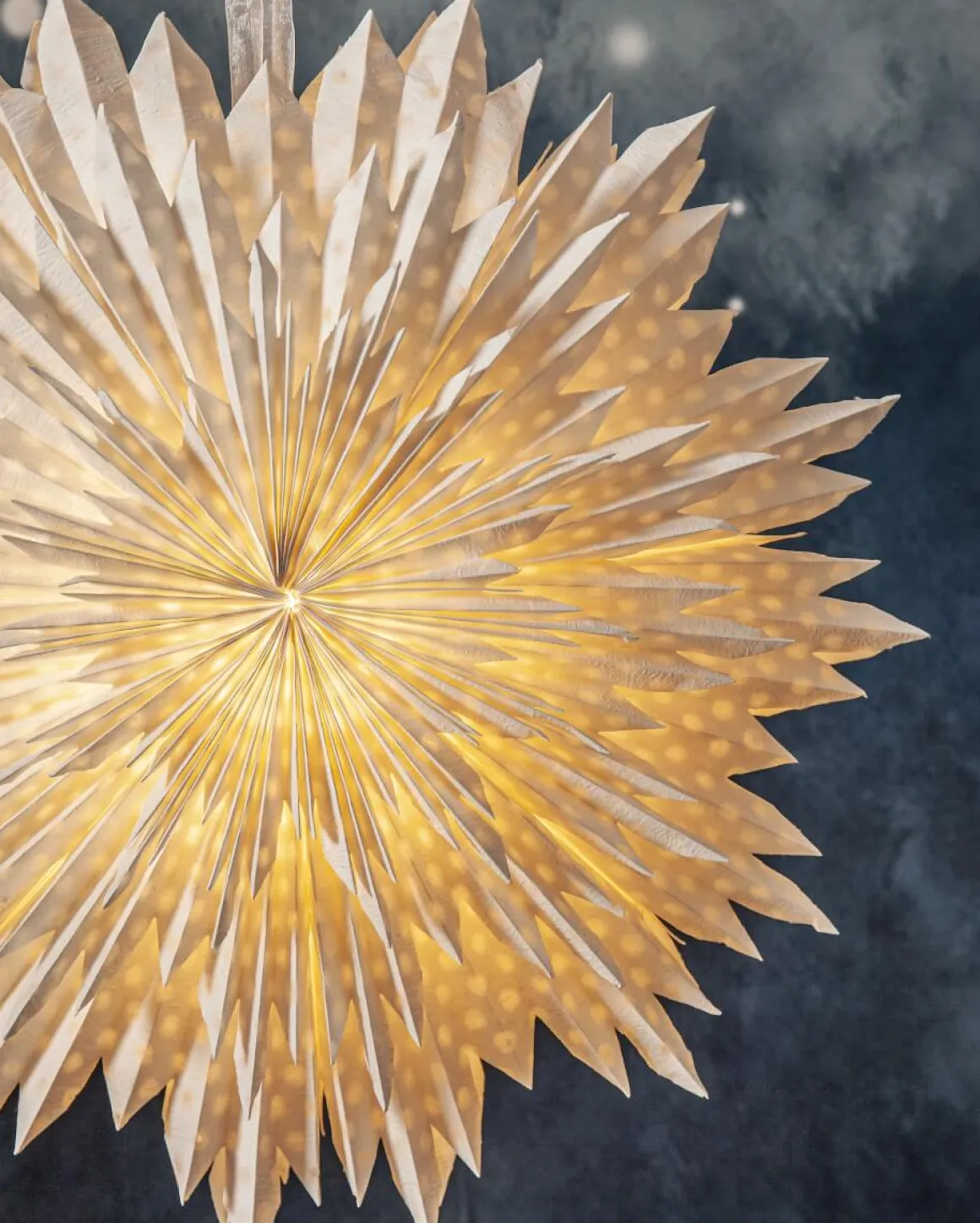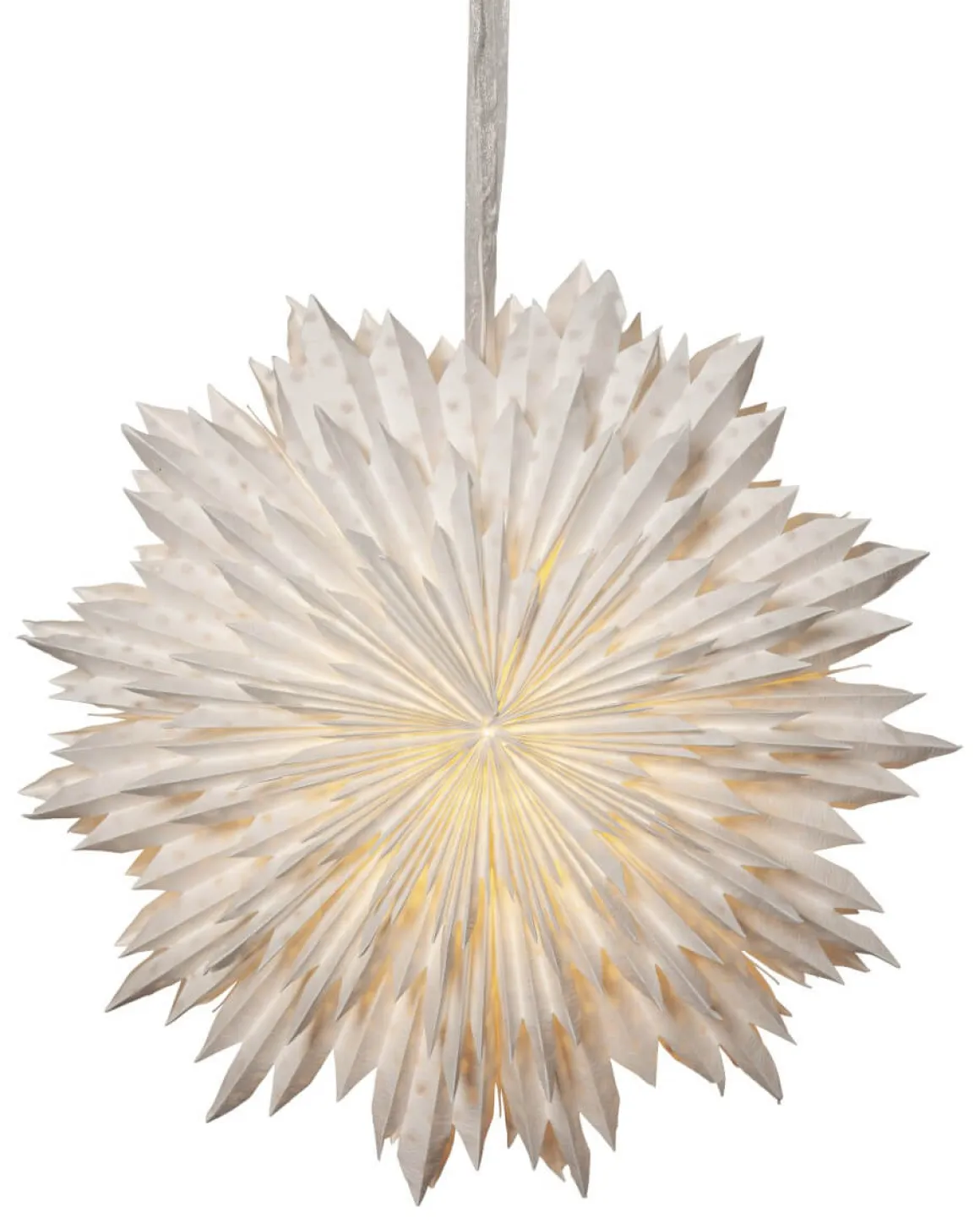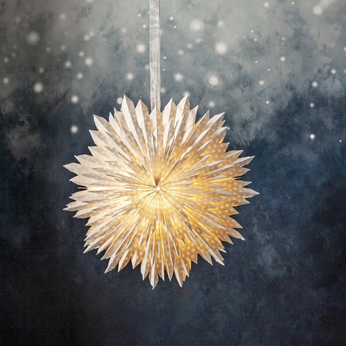 Helt underbar pappersstjärna från Star Trading som är tillverkad av tre lager veckat papper. Pappret är tillverkat av återvunnen bomullsspill från t-shirt tillverkning. Strukturen i pappret blir därför mjukt och i själva pappret ser man vattenstämplade prickar. Konturen är lite ojämn för en vintrigare känsla. Ett elegant band ingår för att lättare kunna hänga upp stjärnan. Stjärnan sprider stämning och ger hemmet den där speciella advent ochjulkänslan. Kan hängas både i fönster och mot en vägg. Sladdställ och ljuskälla köpes separat.