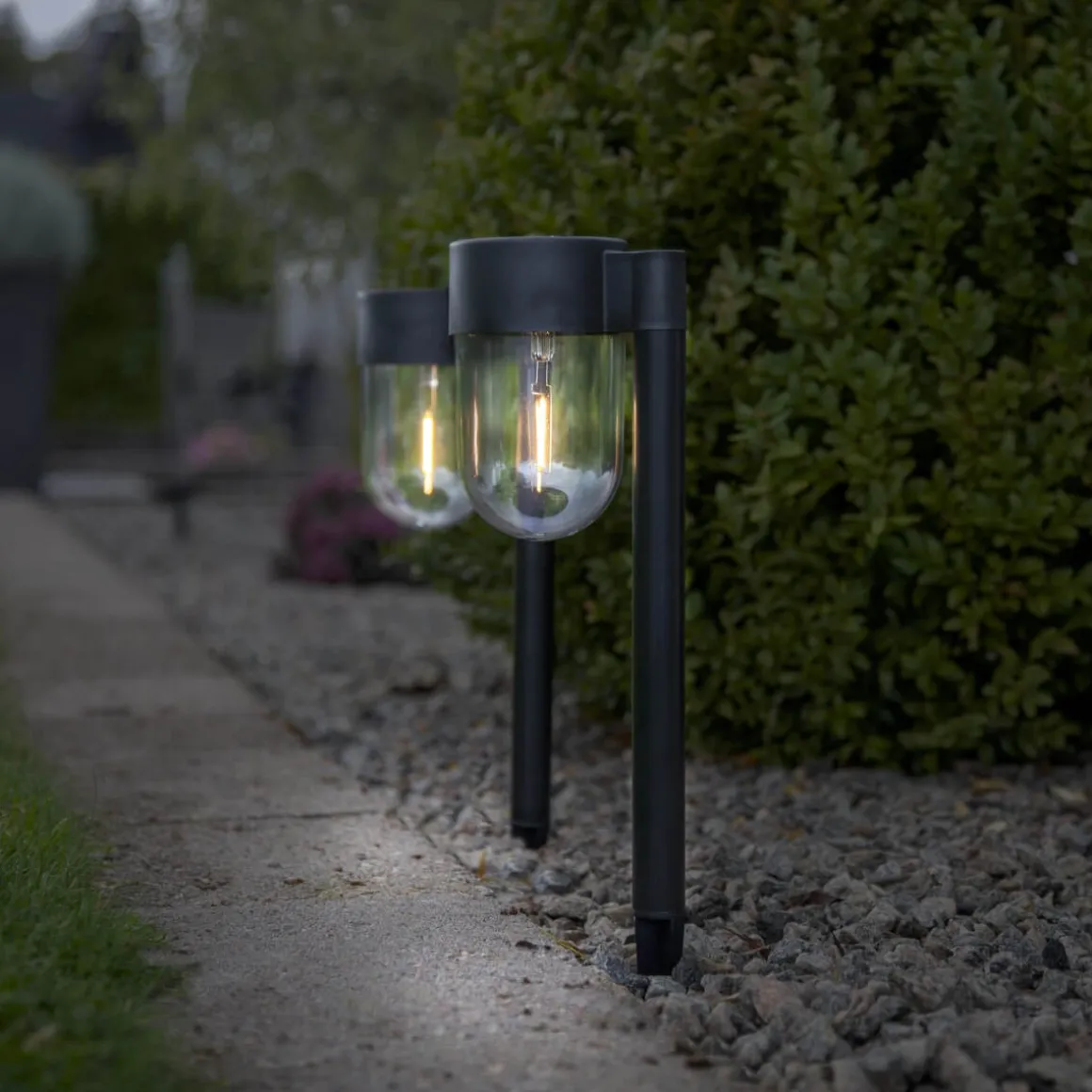 2 pack solcellsbelysning Cupola från Star Trading. Svart liten gångbelysning som riktar ljuset ner mot gången eller kanske ner mot blommorna i rabatten om så önskas. Cupola laddas upp av solens varma strålar för att sedan tändas upp när mörkret kryper på. Lyser gör dem med ett varmt och behagligt sken.