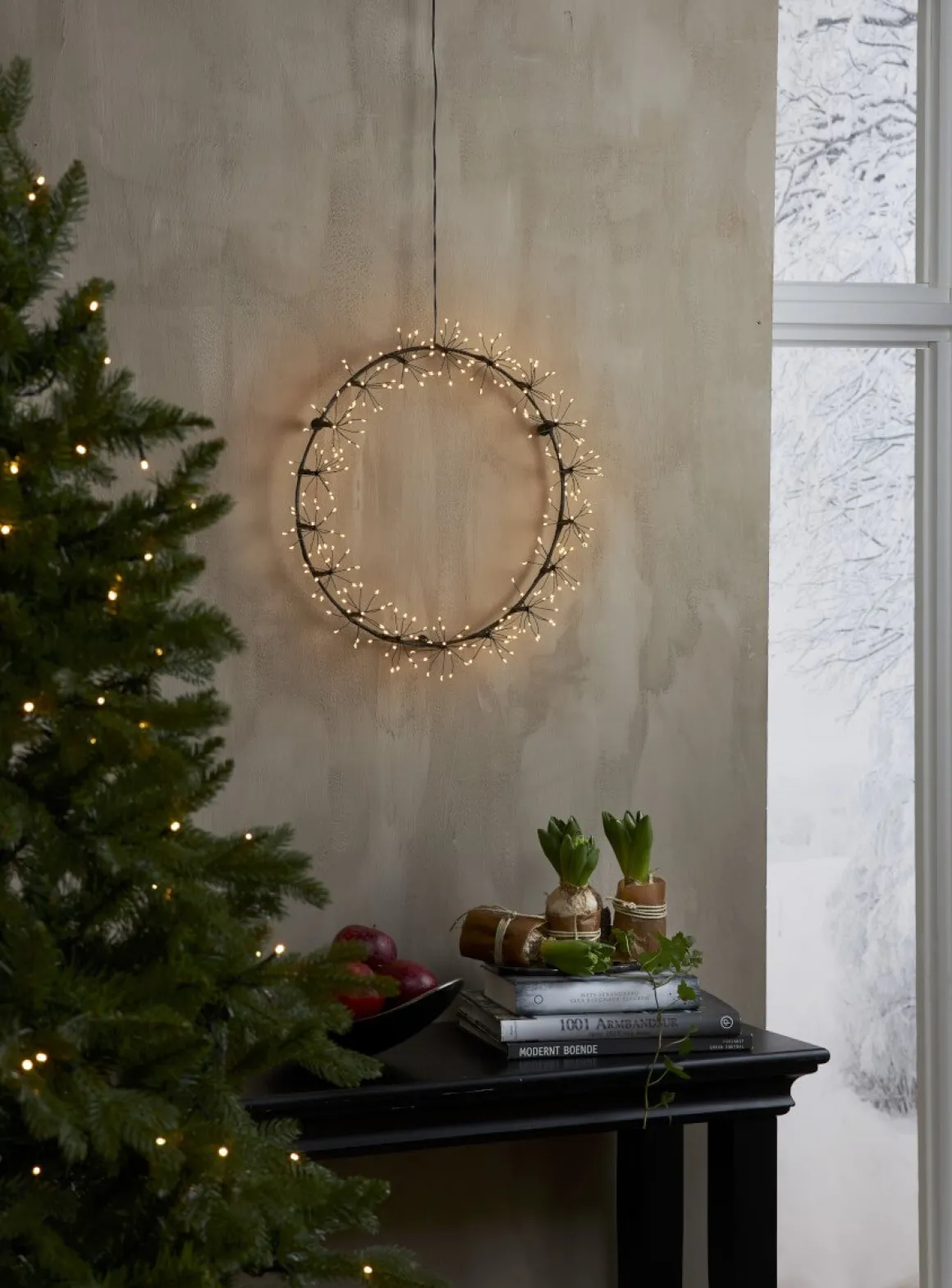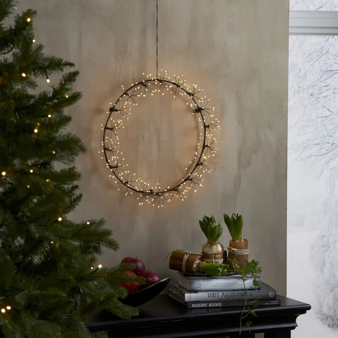 Dew drop flower är en fantastisk krans att hänga mot en vägg eller i ett fönster eller som en dekoration på ett bord. Kransen har 4st kulor som stöd mot väggen/fönster eller ben. 270 små varmvita led punkter som lyser stämningsfullt. Dekorera till jul eller andra festliga tillfällen.
