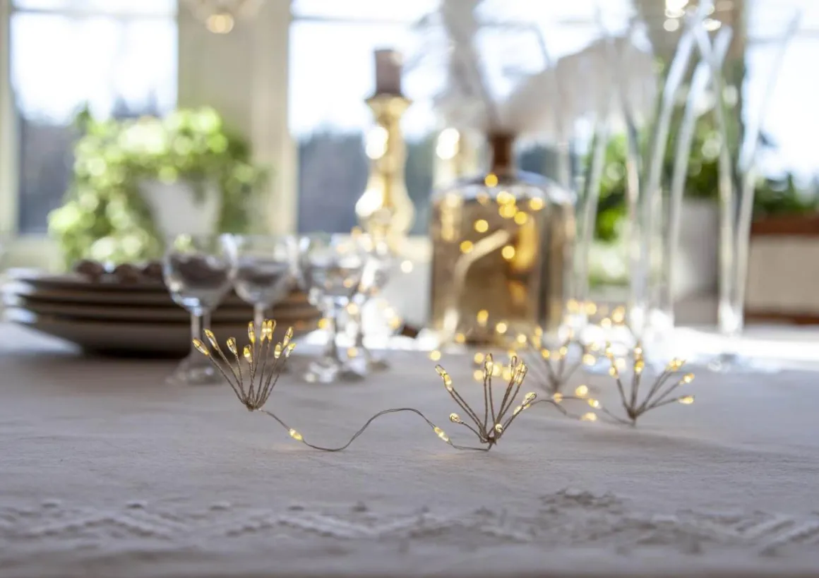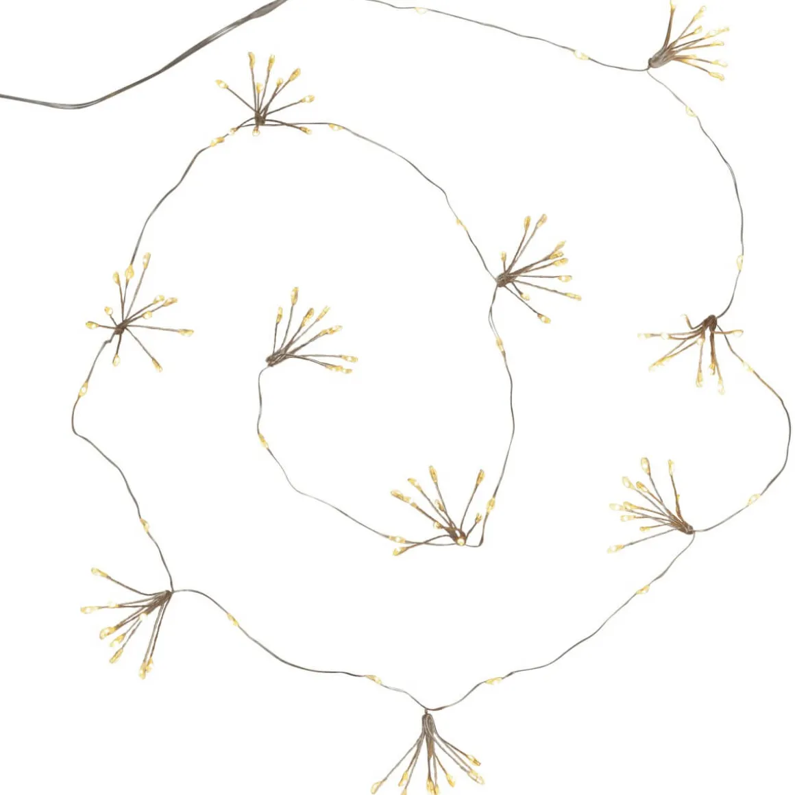 Kolla in denna batteridrivna lilla ljusslingan med små buketter av vackert varmvitt sken. Perfekt dekoration till dukningen för att skapa en härlig atmosfär. 120 små ljuspunkter med silver färgad metallkabel. Batteri box med timer funktion så du enkelt själv kan ställa in när du vill att det ska lysa.