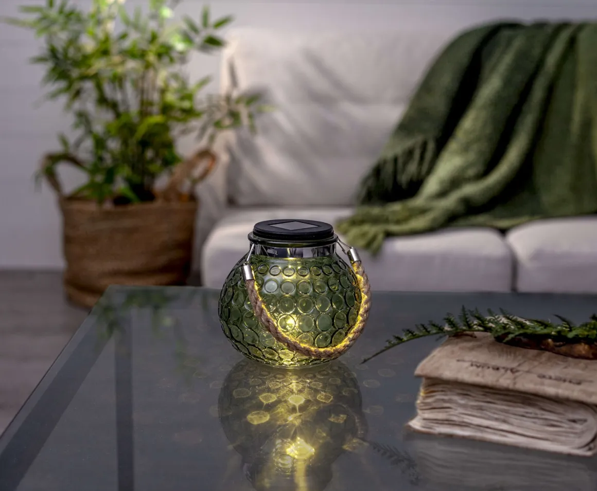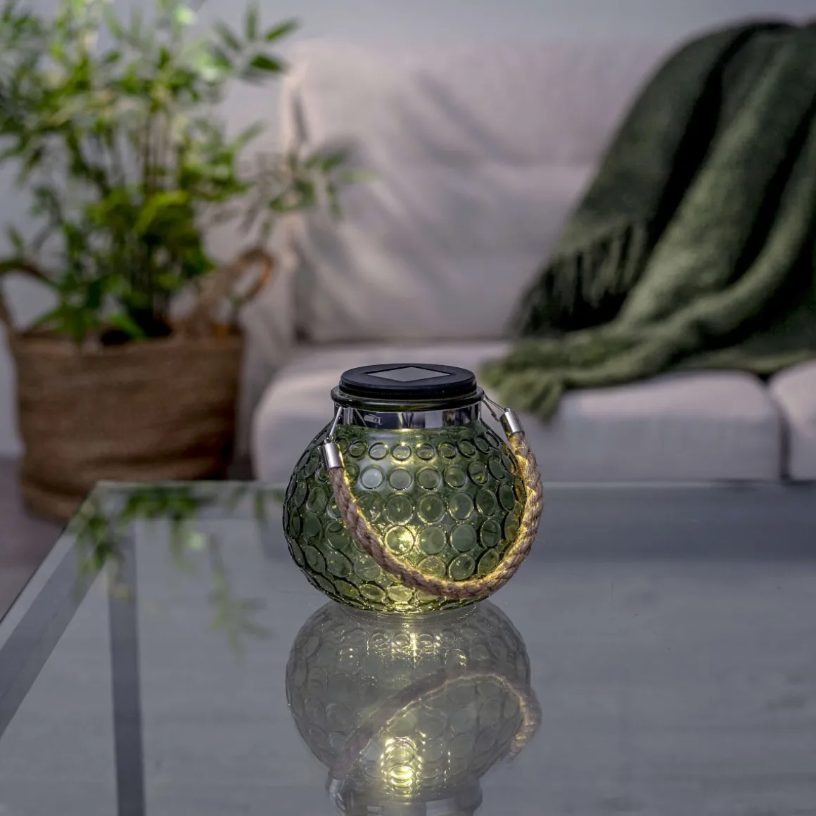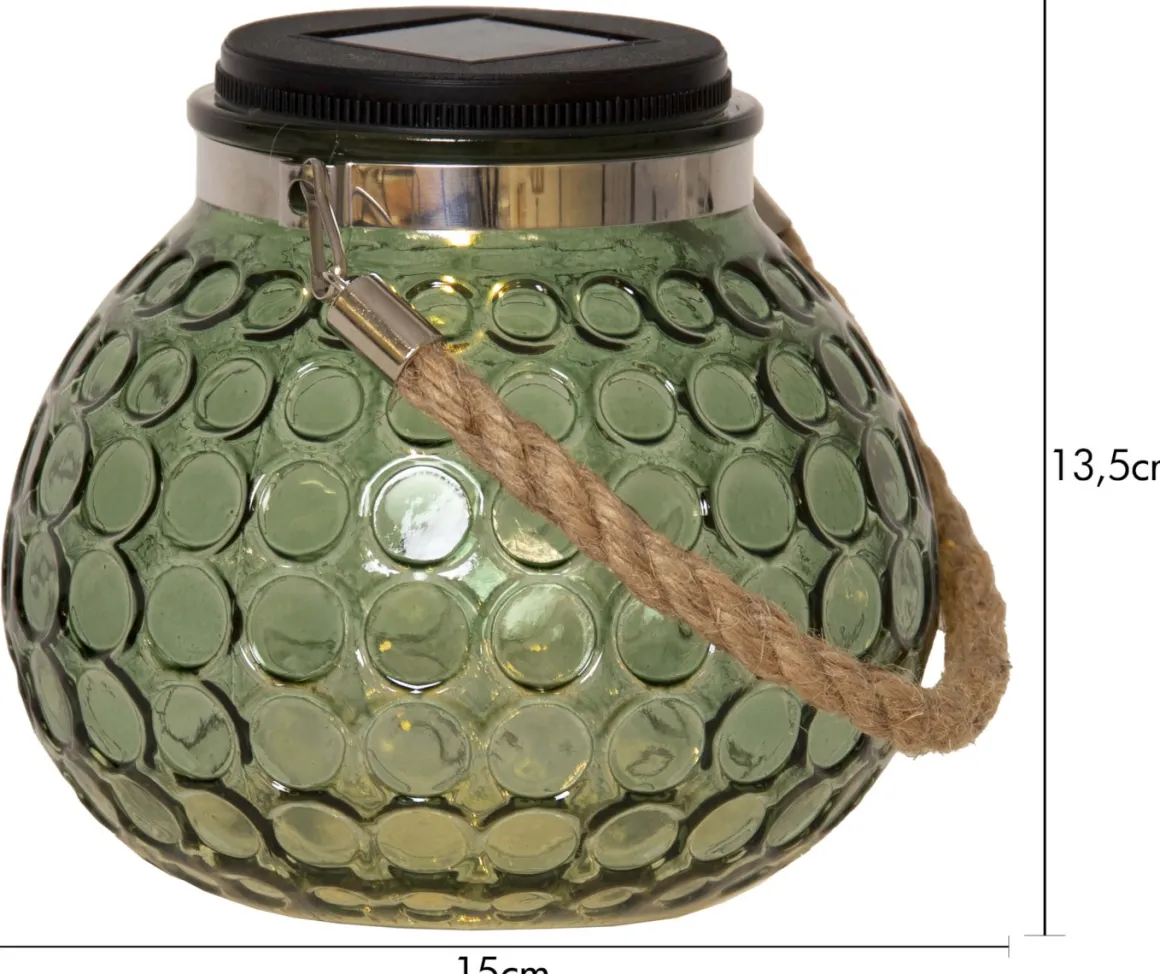 Dotte är en dekorativ solcellslykta från Star Trading i grönt glas med en bubblig yta och rephandtag. Den har en LED-ljuskälla som skapar ett vackert sken i mörkret, vilket gör den till en fin detalj för uteplatsen eller balkongen. För att ladda det medföljande batteriet, placera lyktan i solen under dagen. En perfekt kombination av stil och funktion för att lysa upp din utomhusmiljö!
