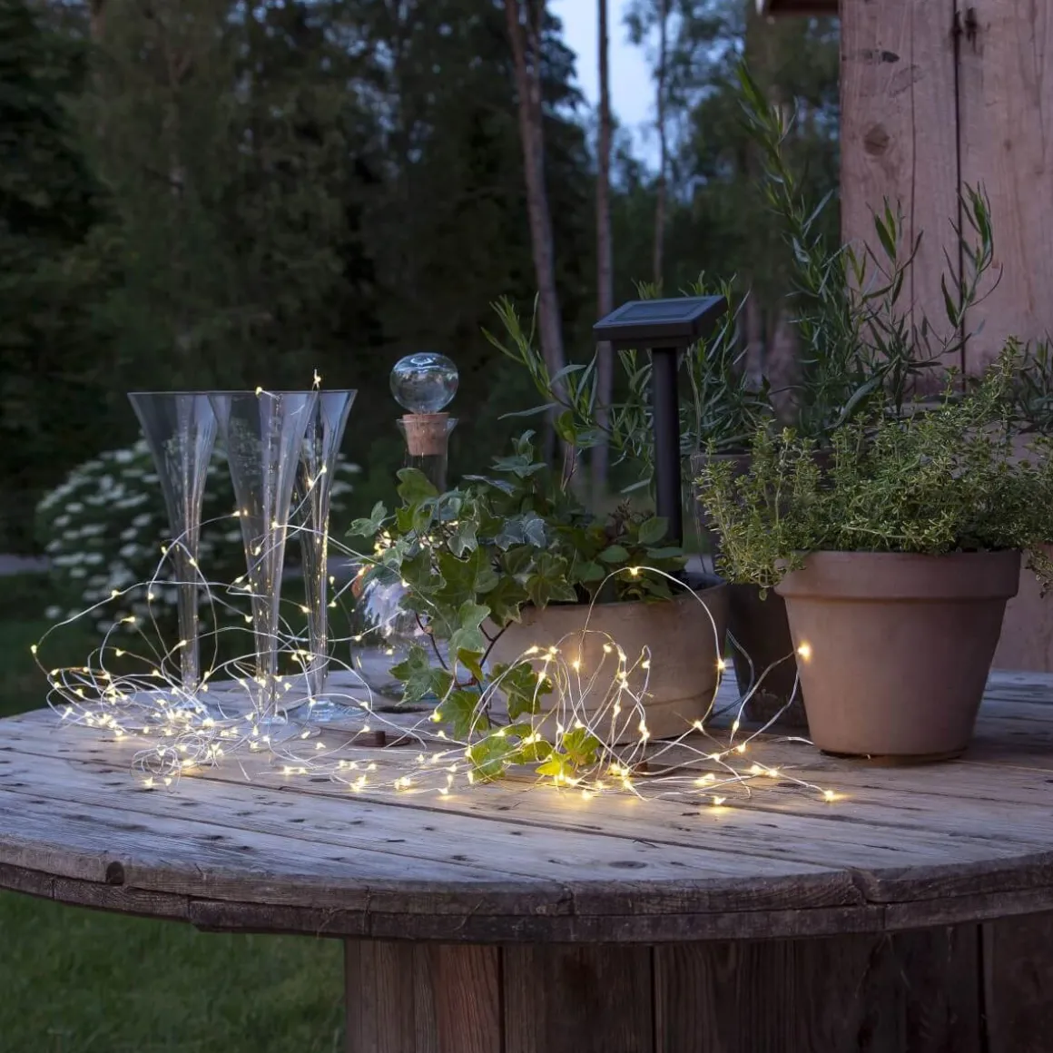 Härlig solcellsdriven Dew drop slinga med varmvita små lampor, slingan är hela 20 meter lång! lamporna laddas upp under dagen och lyser så festligt när mörkret kryper på.