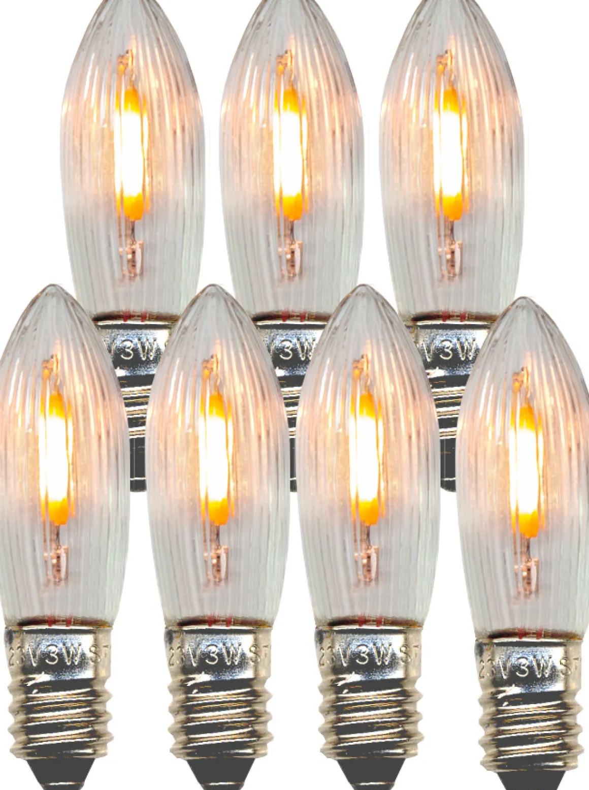 7-pack universal LED-reservlampor. Lamporna har klart glas och E10 sockel, 14-55V. Denna produkt passar tillljusstakar/slingor med 4-16 ljus.