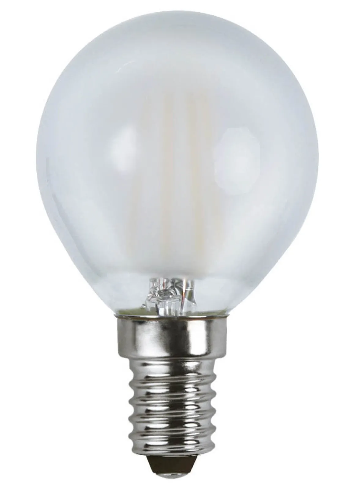 Matt LED-lampa medE14-sockel. Färgtemperaturen är 2700k och ljusflödet är 450 lumen.