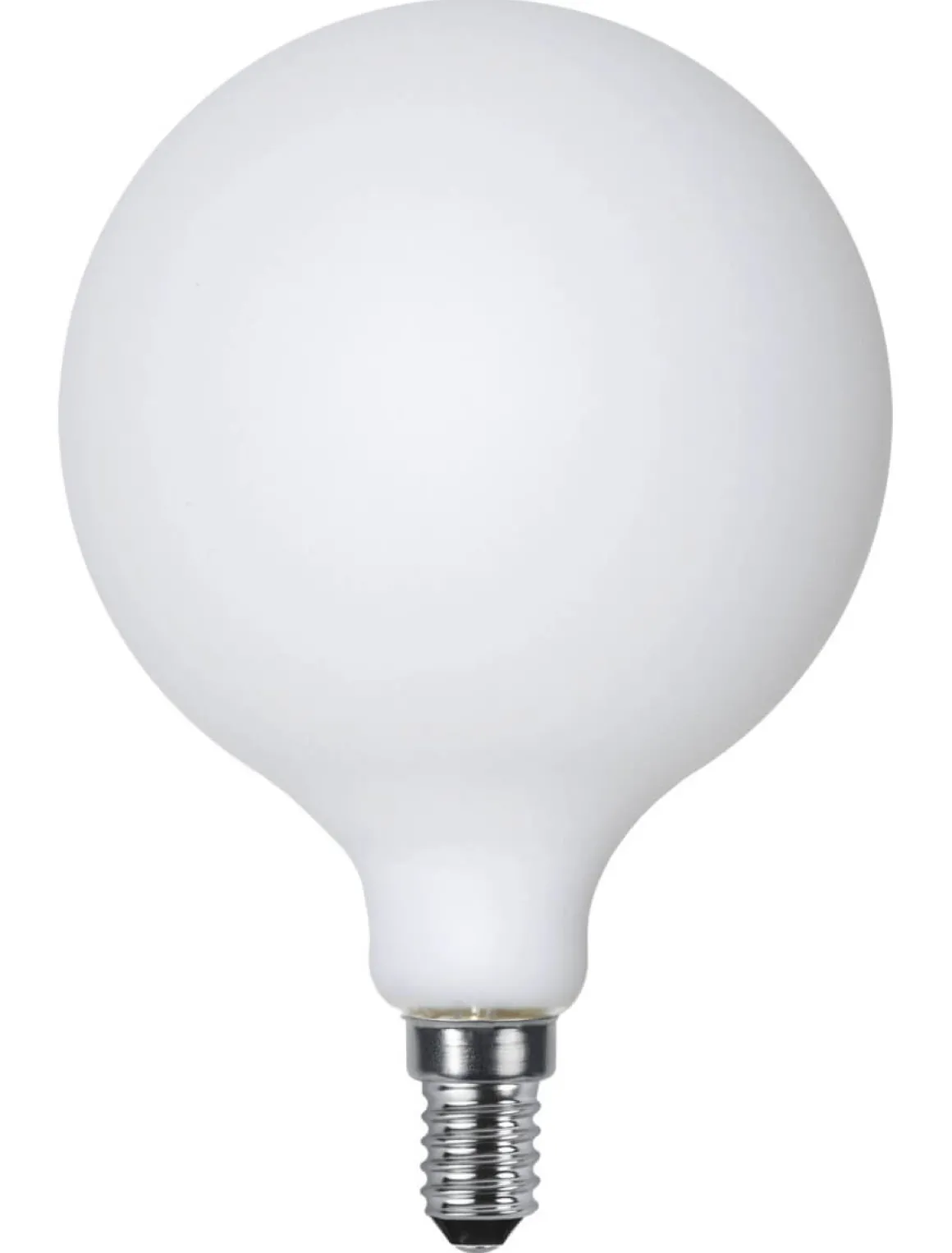 95 mm Glob LED med opalt glas och matt finish som ger ett mjukt behagligt ljus. Passar både för hängande och stående armaturer. E14-sockel, 2700K och dimmerkompatibel.