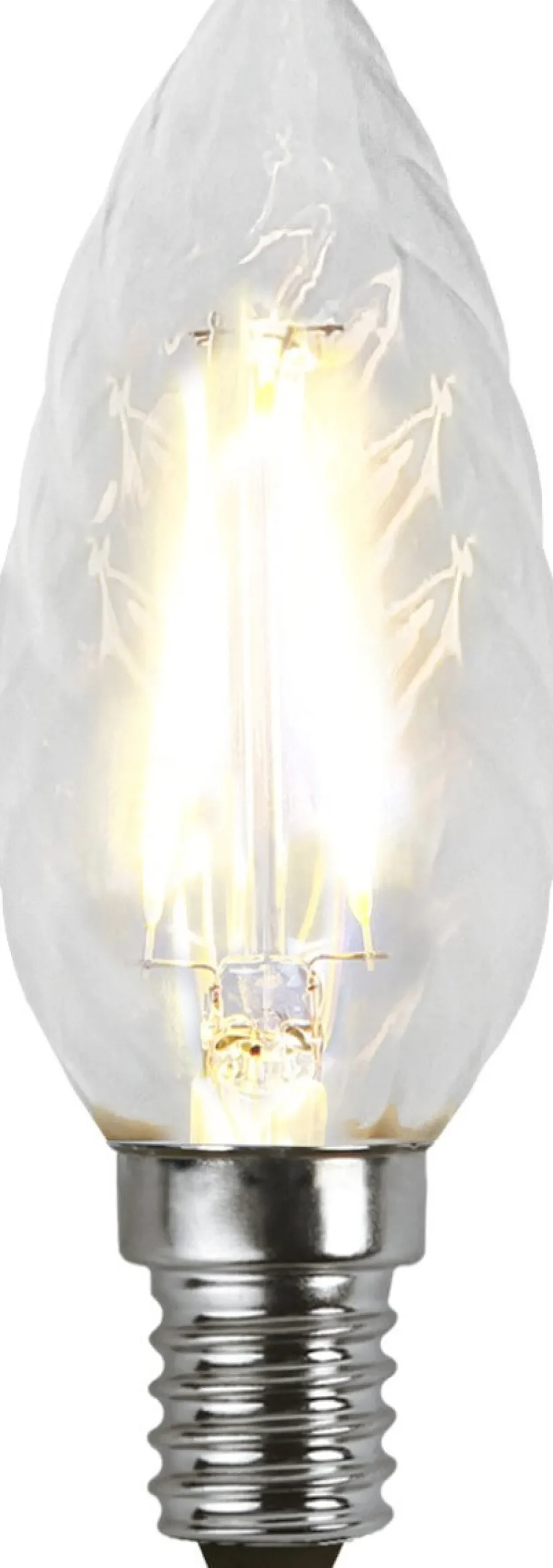 Vridet kronljus LED ljuskälla med E14 sockel. Ljuskällan har en färgtemperatur på 2700K och ett ljusflöde på 150 Lumen.