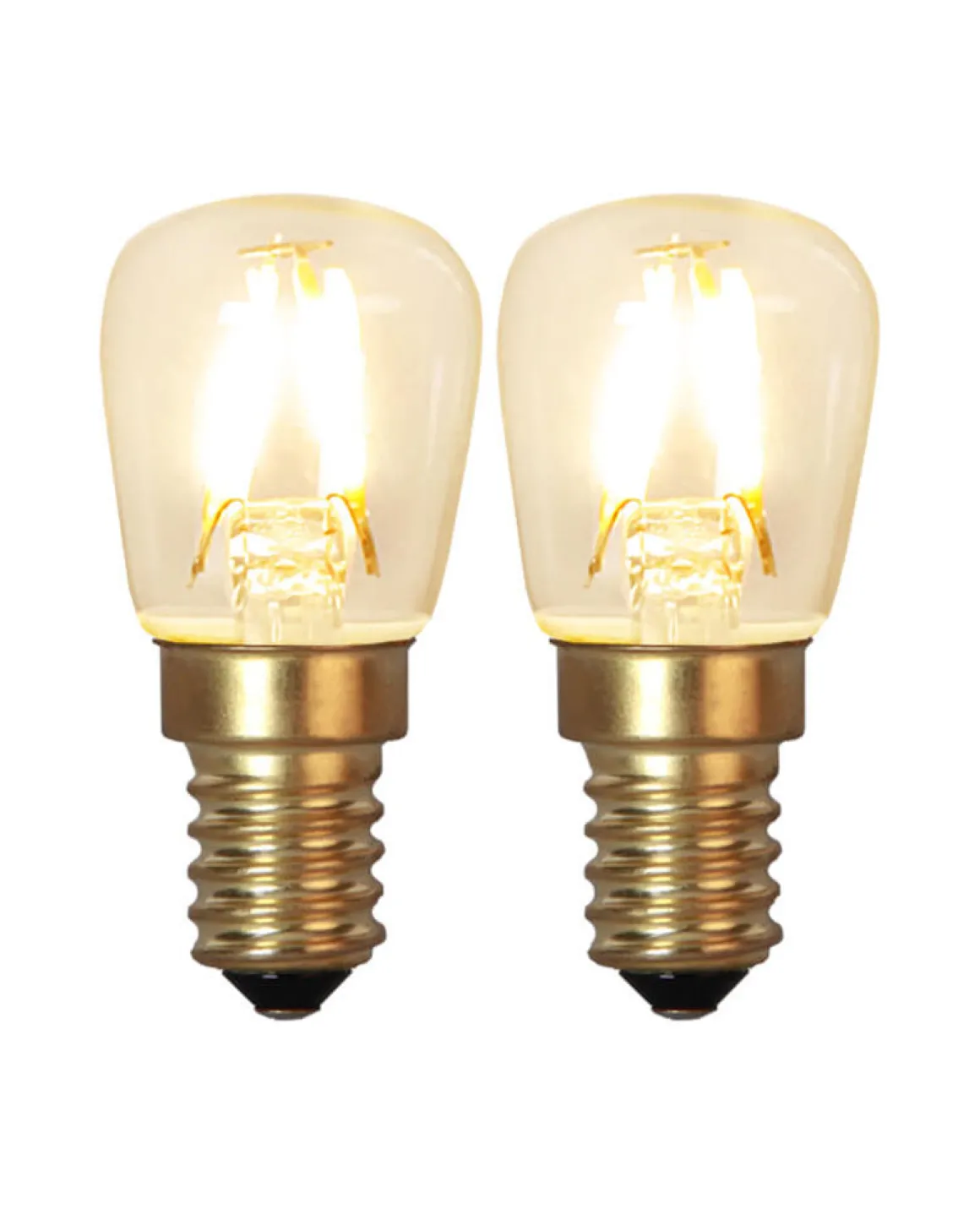 2-pack klara filament LED-lampor med E14-sockel. Lampornas färgtemperaturen är 2100K och ljusflödet är 90 lumen.