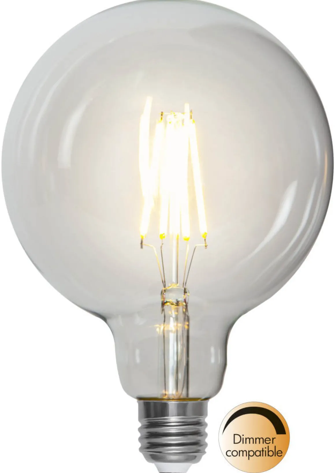 125 mm Glob från Star Trading med klart glas och E27-sockel. Färgtemperaturen är 2700Kmed en ljusstyrka på 806 lumen och du! den är dimmerkompatibel.