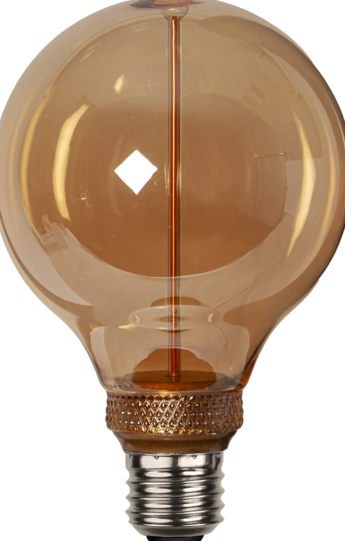 Amberfärgad ljuskälla av modell glob 95 från Star Trading med 3-stegs klickdimring! Ljusstyrkan ändrar du enkelt genom att slå av och på strömbrytaren. Välj mellan 20lm, 50lm eller 100lm. Ljusfärgen är 1800K och sockeln är E27. Minnesfunktion gör att ljuskällan startar på senast valda ljusstyrka.