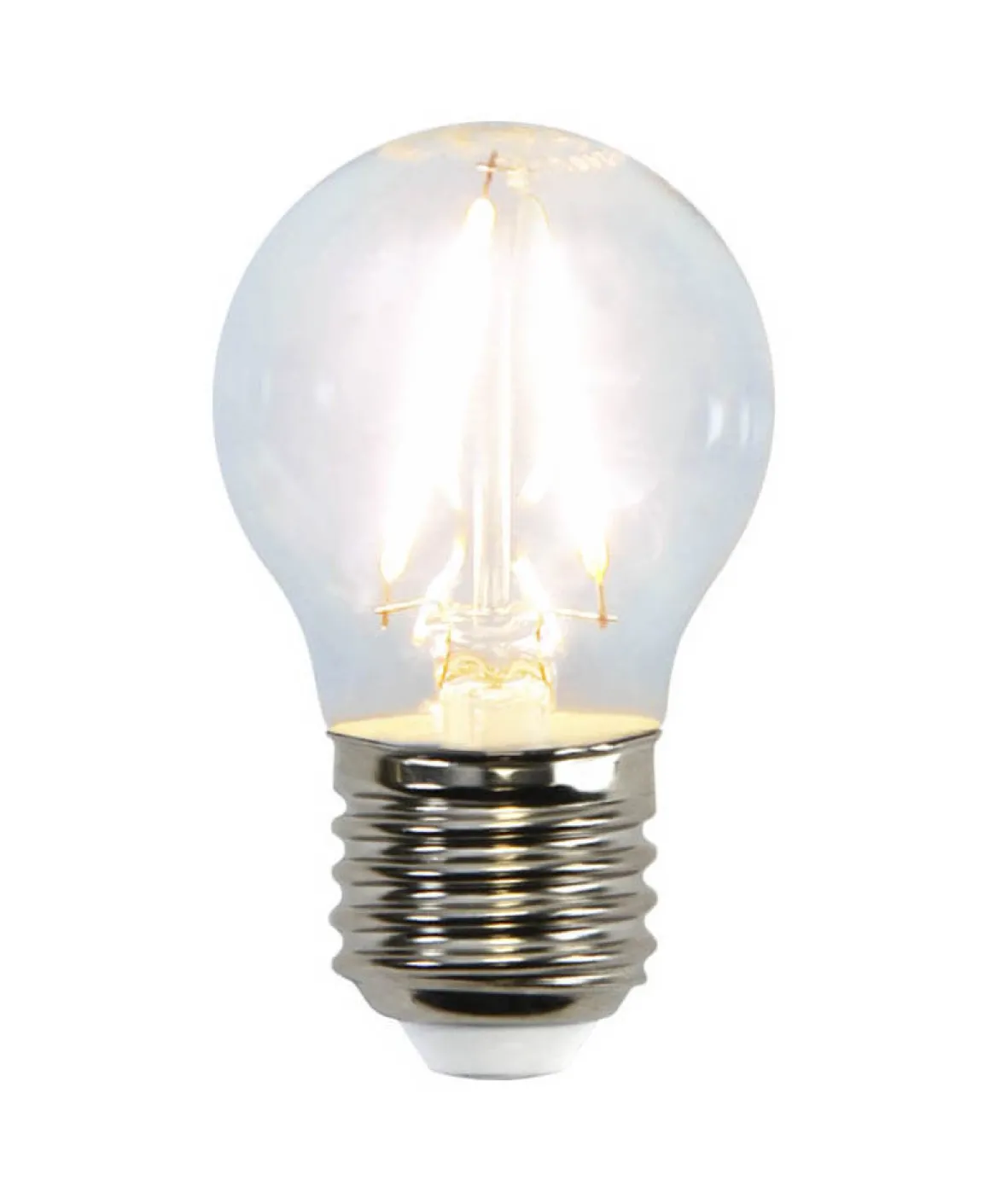 Klar LED-lampa medE27-sockel. Färgtemperaturen är 2700k och ljusflödet är 250 lumen.