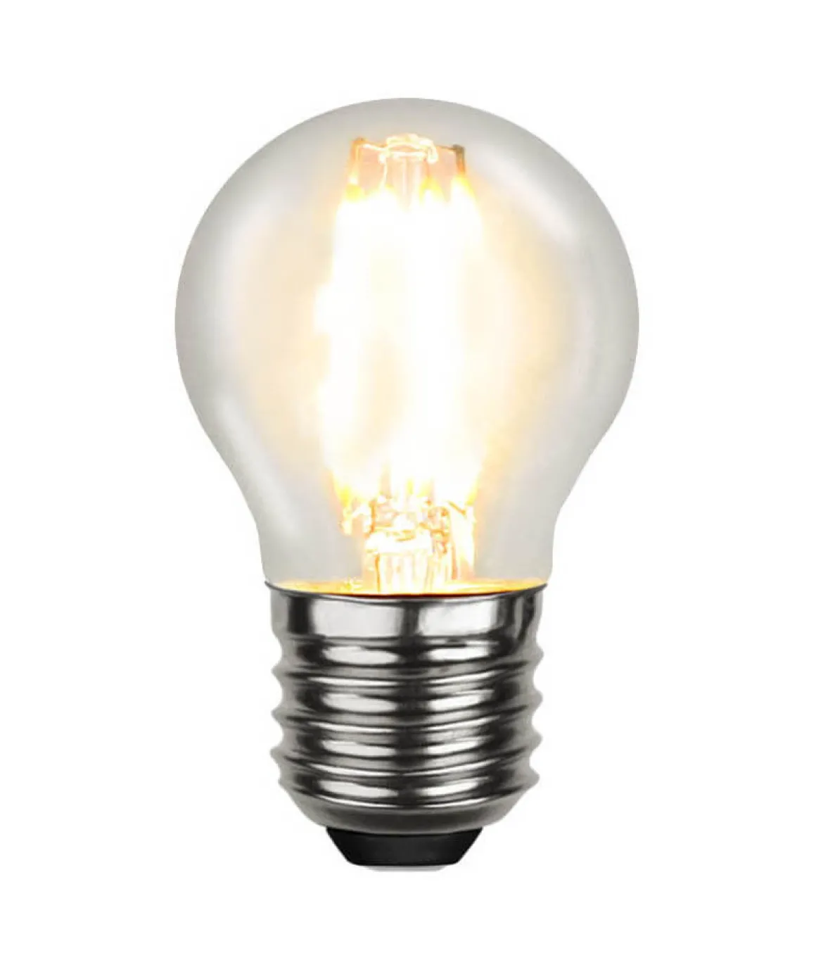 Klar LED-lampa medE27-sockel. Färgtemperaturen är 2700k och ljusflödet är 470 lumen.
