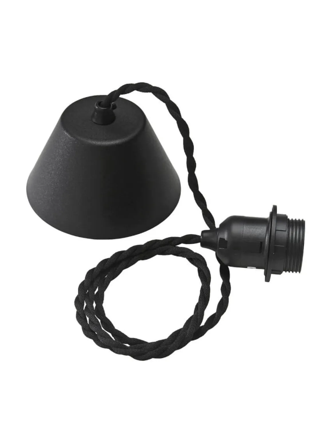 Takupphänge med tvinnad svart textilsladd från PR-Home 1,2m lång, vit E27 lamphållare med ringfäste, vit takkopp och en kopplingsplint. Takkontakt ingår ej.